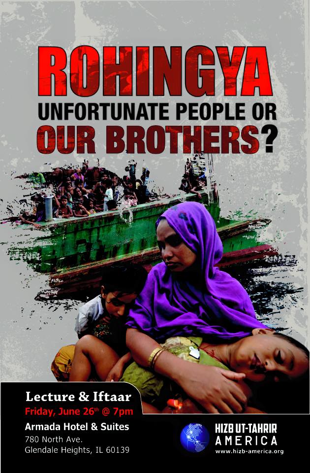 ضمن فعاليات المكتب الإعلامي المركزي لحزب التحرير العالمية لنصرة مسلمي الروهينجيا، عقد حزب التحرير في أمريكا ندوة بعنوان "الروهينجيا شعب غير محظوظ أم أخوة لنا؟!!"، وقد بدأت الندوة بعرض فيلم مصور بين معاناة مسلمي الروهينجيا. وبعد ذلك أُلقيت محاضرة بين خلالها المحاضر حقيقة المؤامرة على مسلمي الروهينيجا والسكوت المخزي من قبل دول العالم تجاههم. وفي النهاية بين أن الحل الجذري لهم لن يكون إلا بإقامة دولة الخلافة على منهاج النبوة والتي ستحرك الجيوش لنصرتهم وإعادتهم إلى أرضهم وبيوتهم. واختتمت الندوة بجلسة نقاش أجاب المحاضر فيها على تساؤلات واستفسارات الحضور.