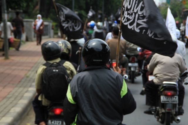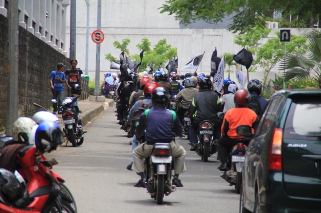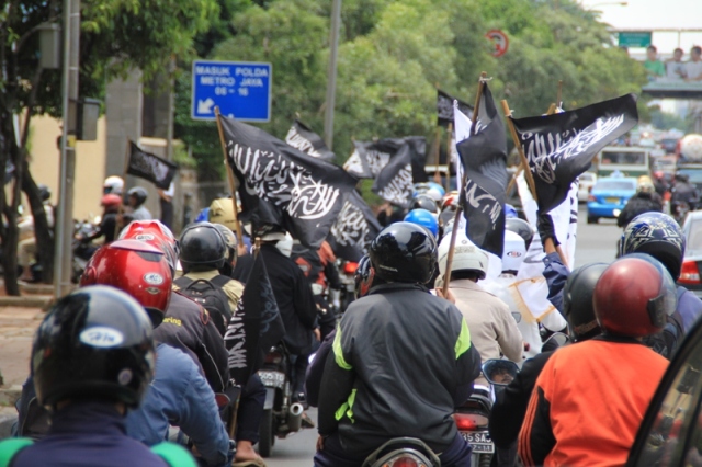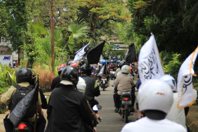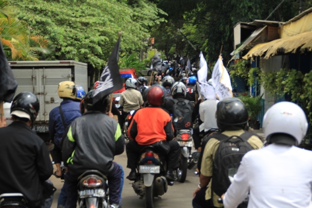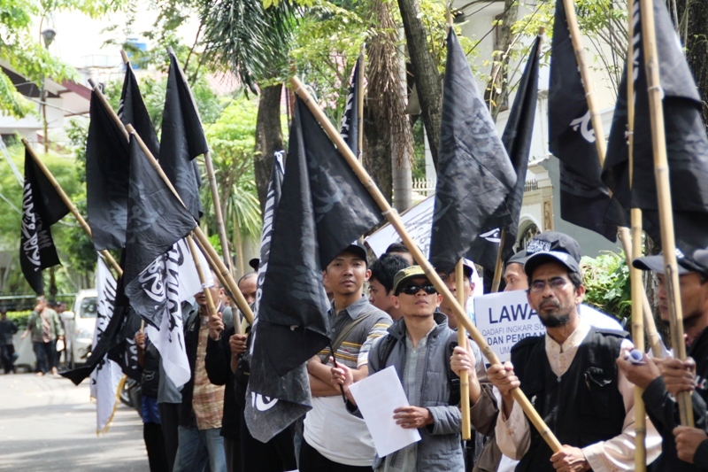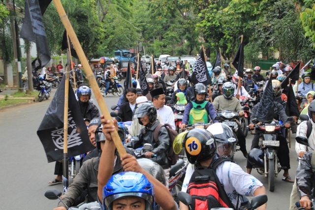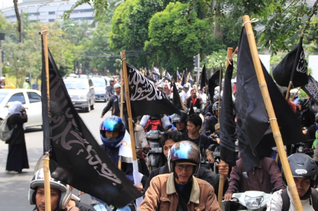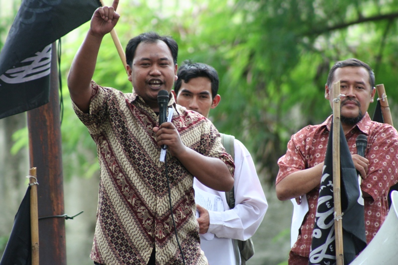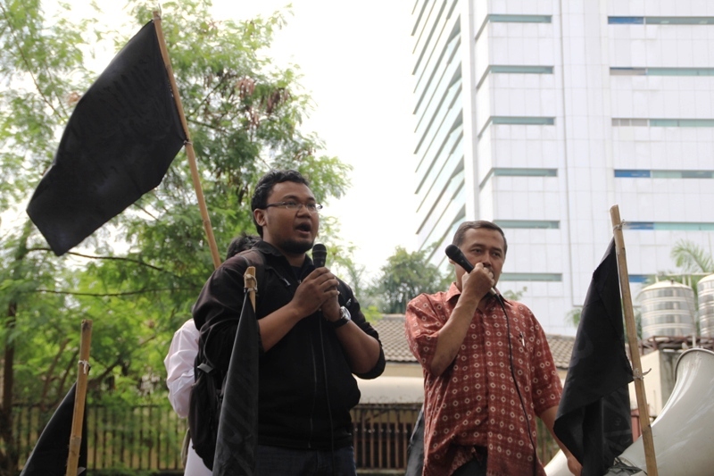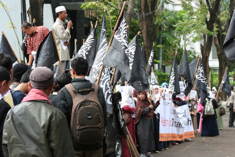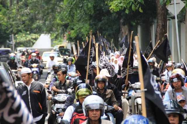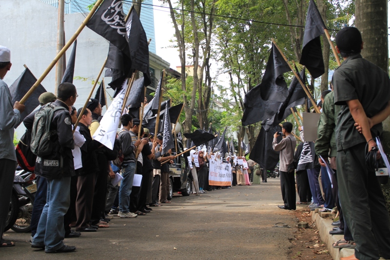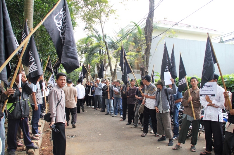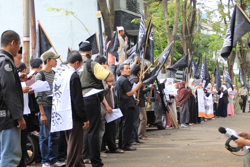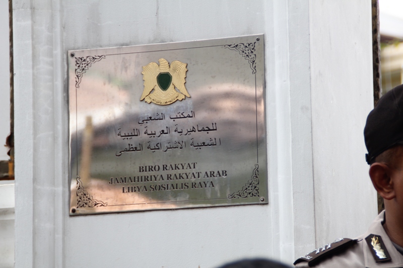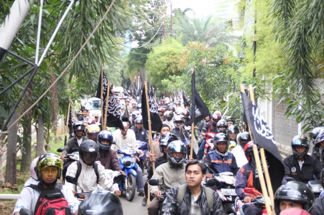 جاكارتا: يوم الخميس 24/2 قام ما يقارب من مئتي مسلم بالتظاهر امام السفارة الليبية تظامنا مع اهلهم في ليبيا ،ودعوتهم الى الاستمرار في الكفاح من اجل اسقاط الطاغية الليبي الذي يفضل قتل الشعب الليبي على حمايتهم. وقد اكد حزب التحرير في جاكارتا انه لا ينبغي للشعب الليبي القبول بزوال الطاغية فقط، بل باخراج الاستعمار و ادواته من العملاء الموجودين في البلاد ،والاستمرار في الكفاح من اجل اقامة الاخلافة الاسلامية، والتغيير الجذري الشامل للنظام الليبي والانظمة الموجودة في العالم الاسلامي ،واستبدالها بنظام الخلافة الاسلامي والذي به تحل كل المشاكل في ليبيا و العالم كله. و قد شدد الحزب في اندونيسا على الوعي لدى اهل ليبيا و حثهم على عدم السماح لاحد من خطف هذه الثورة و التحايل عليها واستبدال نظام بنظام اخر ليس اسلامي. و اكد على عدم السماح لدول الغرب( امريكا و بريطانيا )من الاستيلاء والتحايل على هذه الثورة. وقد ذكر فريد واحد الناطق باسم حزب التحرير- اندونيسيا- ان هذه الحركات الكفاحية التي تحدث في دول العالم الاسلامي هي شكل من اشكال مقاومة الشعوب لحكامهم و رفضهم لهم، وهو رد طبيعي من الناس نتيجة للاضطهاد و سلب الحقوق و الظلم، و ليس هو دعوة الى الليبرالية و الدمقراطية، فمشاعر الناس و الشعوب مشاعر اسلامية، و تريد الاسلام كنظام للحكم ،ولن تقبل غيره مهما طبق عليهم . وقد ذكر الشعب الليبي والاندونيسي بما قام به الطاغية القذافي من جرائم من خلال رفع شعارات منها: القذافي عدو الله و رسولة رفض السنه و طبق الكفر، و منها ايضا القذافي شناق شباب حزب التحرير الثلاثة عشر في شوارع ليبيا ليس لشيء الا لانهم انكروا عليه انكار السنة المشرفة.