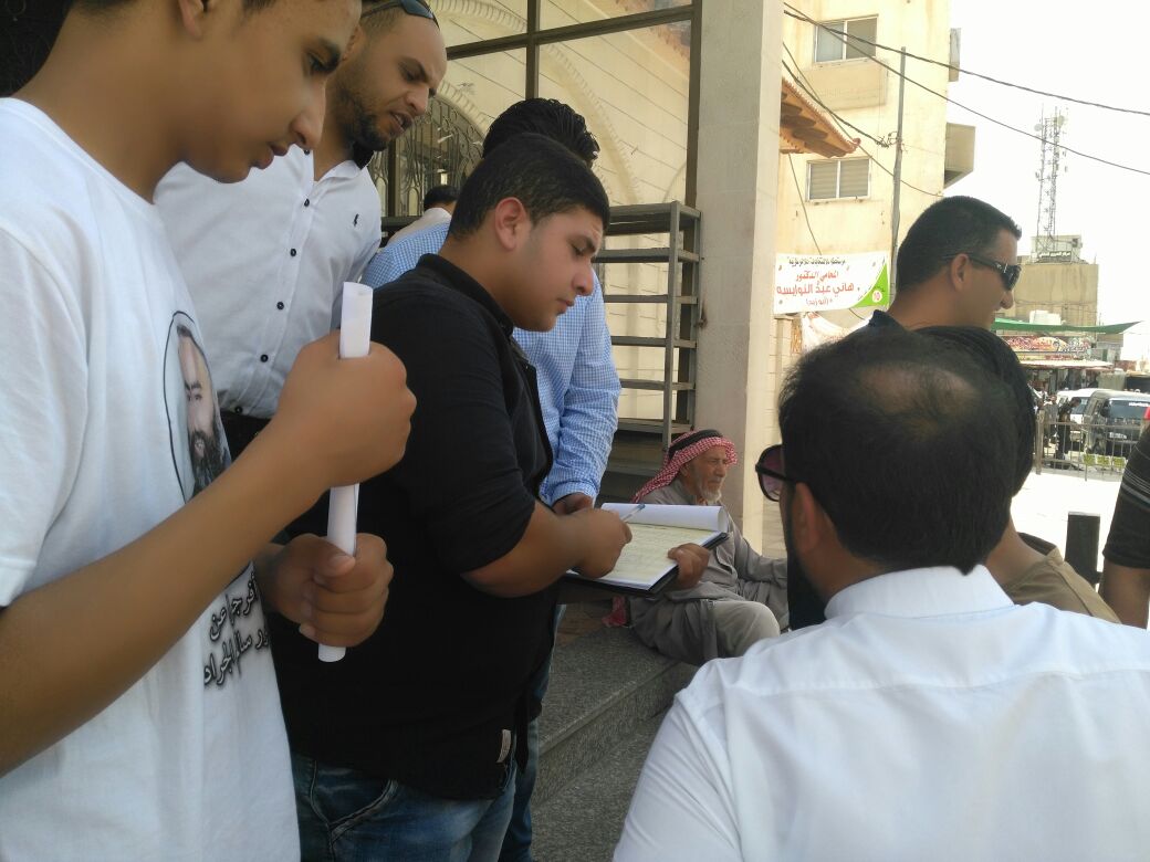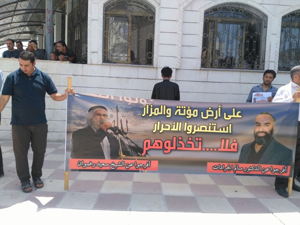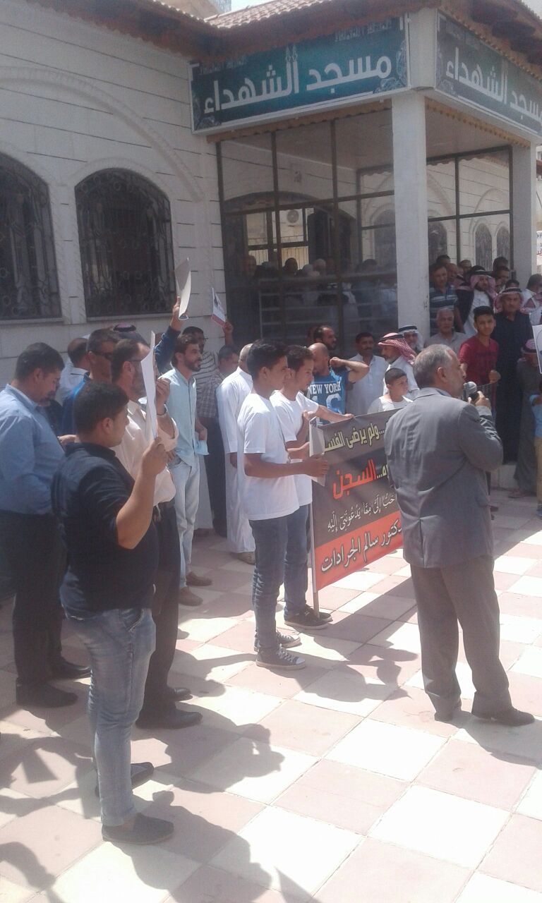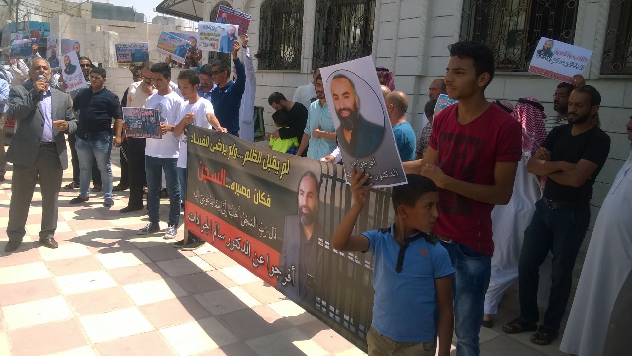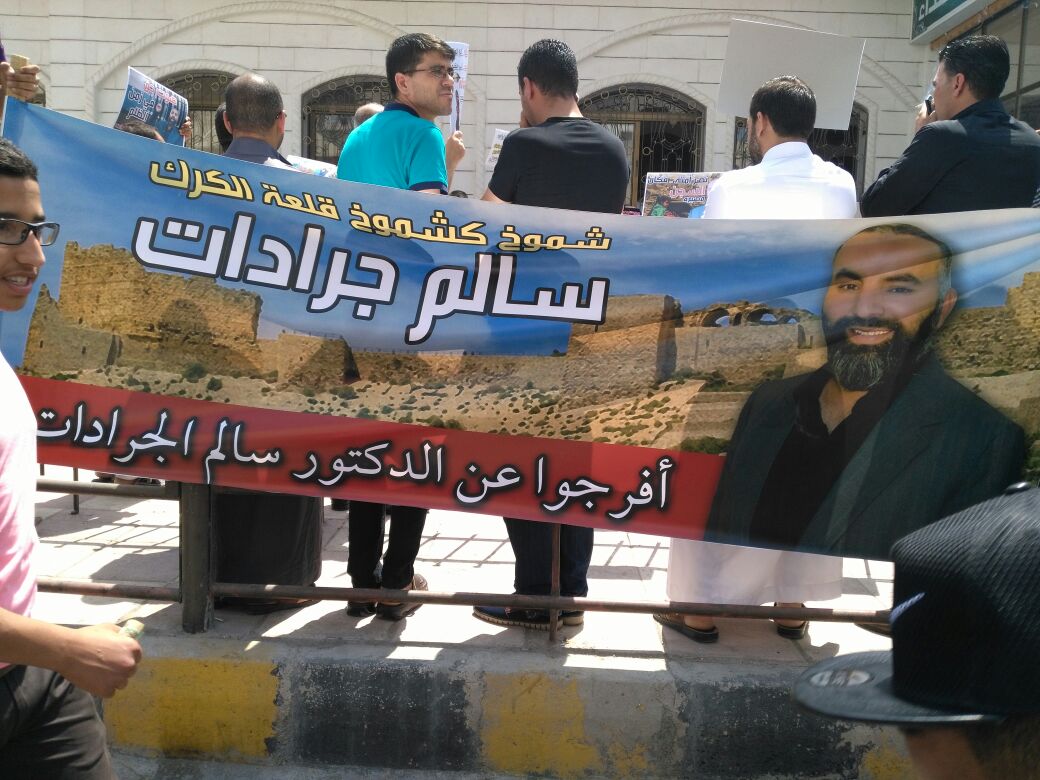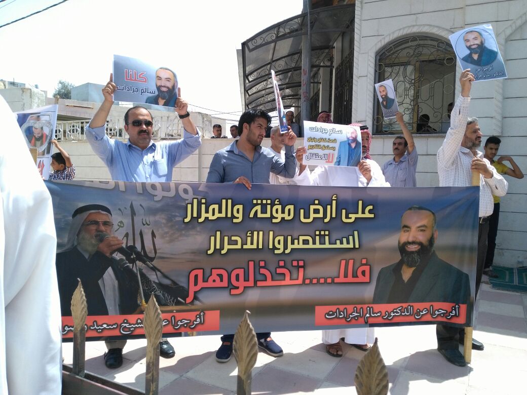 نظم أهالي وأقرباء وأصدقاء وطلاب الدكتور سالم جرادات المعتقل في سجون الأردن منذ تاريخ 2017/02/08، وقفة أمام مسجد الشهداء في منطقة مؤتة في مدينة الكرك اليوم الجمعة 2017/08/25؛ للمطالبة بالإفراج عن ابنهم الدكتور سالم جرادات ومطالبين برفع الظلم عنه وعن إخوانه معتقلي الرأي لا لشيء إلا أنهم يقولون ربنا الله...