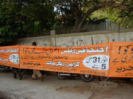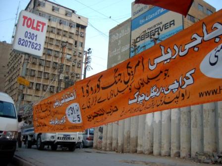 يستمر حزب التحرير ولاية باكستان في حملته " لإيقاف الحرب الأمريكية التي جعلت المسلمين يقتلون بعضهم بعضا"، حيث تم تعليق اليافطات الكبيرة في شوارع عديدة في مدينة كراتشي والتي تعلن عن المسيرات الحاشدة التي سينظمها الحزب في 31/5 القادم، حيث ستنظم المسيرة في كراتشي في مركز المدينة. وقد علقت اليافطات أمام المحكمة العليا في المدينة وأمام محكمة الاستئناف فيها. وعلى تقاطع الطرق في المدينة.