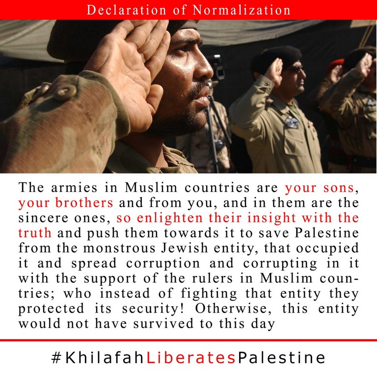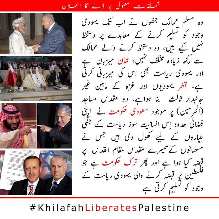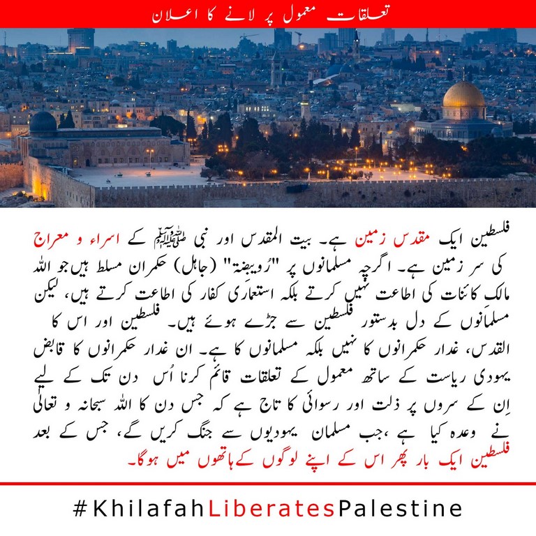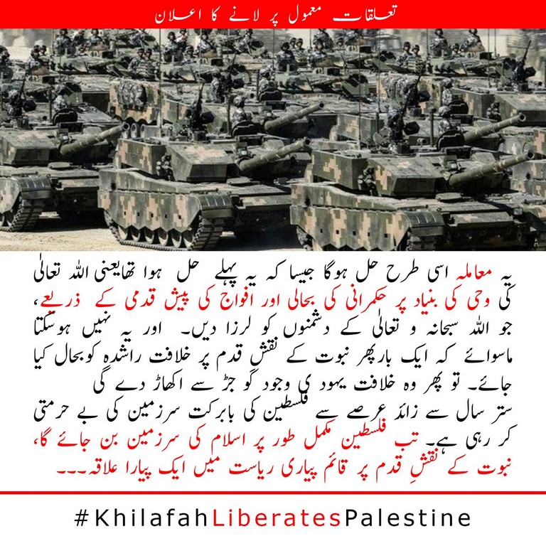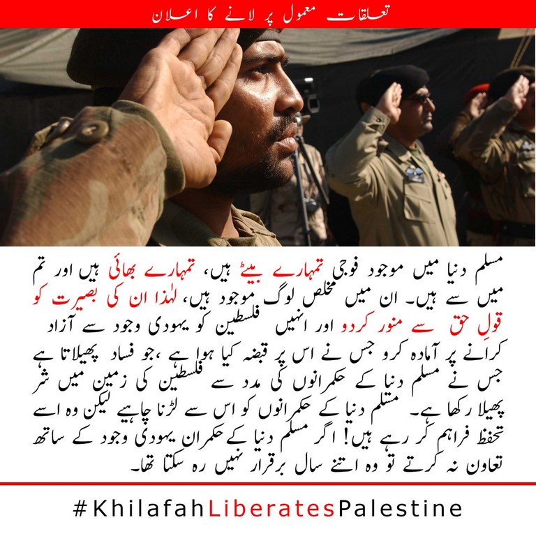 يقوم حزب التحرير / ولاية باكستان بتنظيم حملة واسعة على مواقع التواصل (الاجتماعي) حملة على مواقع التواصل الاجتماعي بخصوص الموقف الخياني لقادة المسلمين تجاه كيان يهود المحتل. وتدعو الحملة إلى رفض حل الدولتين على أساس حدود ما قبل 1967. كما تدعو إلى التحرك الفوري للقوات المسلحة المسلمة في العالم الإسلامي لتحرير كل الأرض المباركة (فلسطين) من الاحتلال اليهودي.