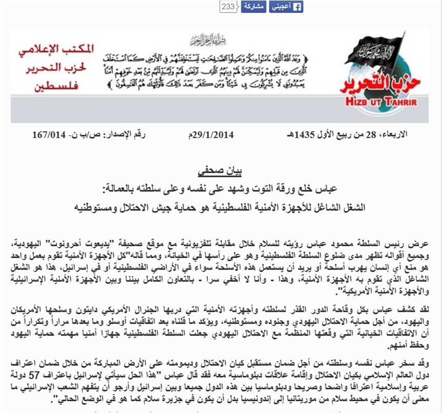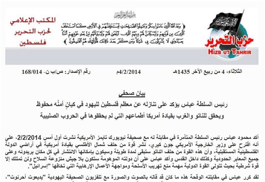 "فجر المكتب الإعلامي لحزب التحرير فلسطين اليوم قنبلة من العيار الثقيل في وجه رئيس السلطة الفلسطينية محمود عباس عندما أصدر بياناً صحفيا تحت عنوان:"عباس خلع ورقة التوت وشهد على نفسه وعلى سلطته بالعمالة: الشغل الشاغل للأجهزة الأمنية الفلسطينية هو حماية جيش الاحتلال ومستوطنيه"."