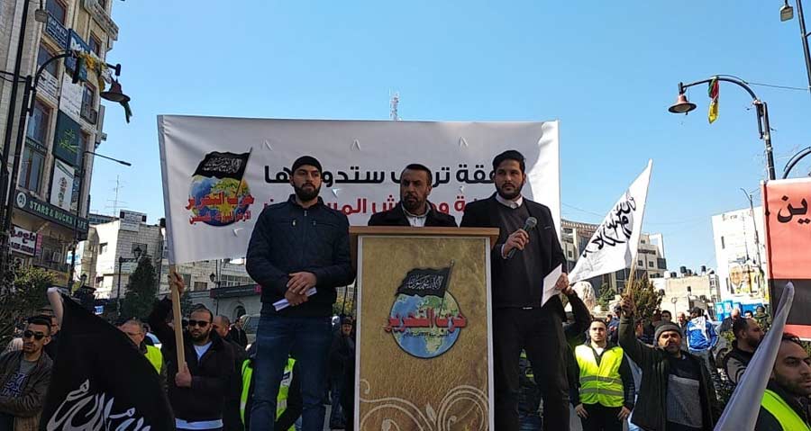 وتحت شعار (صفقة ترامب ستدوسها الخلافة وجيوش المسلمين) احتشد الآلاف من أنصار الحزب على دوار المنارة في رام الله وفي وسط مدينة جنين، حيث رفعوا الرايات والألوية والشعارات المنددة بصفقة ترامب وباللجوء لمجلس الأمن وبحل الدولتين، وهتفوا مستنصرين جيوش المسلمين بضرورة تحركها العاجل لتحرير فلسطين واقتلاع كيان يهود.
