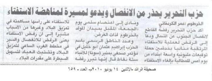 - صحيفة الرائد؛ وهي الناطقة بلسان حزب المؤتمر الوطني الحاكم، أوردت خبراً بعنوان: (حزب التحرير يحذر من الانفصال ويدعو لمسيرة لمناهضة الإستفتاء).