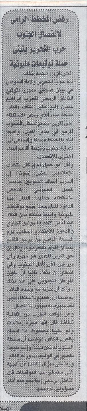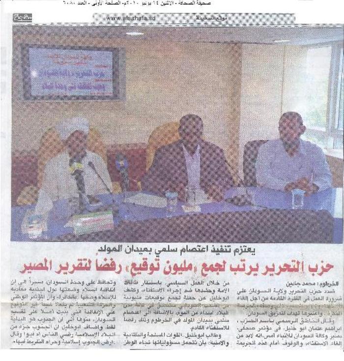 - صحيفة الصحافة؛ وهي من أعرق الصحف السودانية، أوردت في صفحتها الأولى خبراً بعنوان: (يعتزم تنفيذ اعتصام سلمي بميدان المولد، حزب التحرير يرتب لجمع مليون توقيع رفضاً لتقرير المصير).