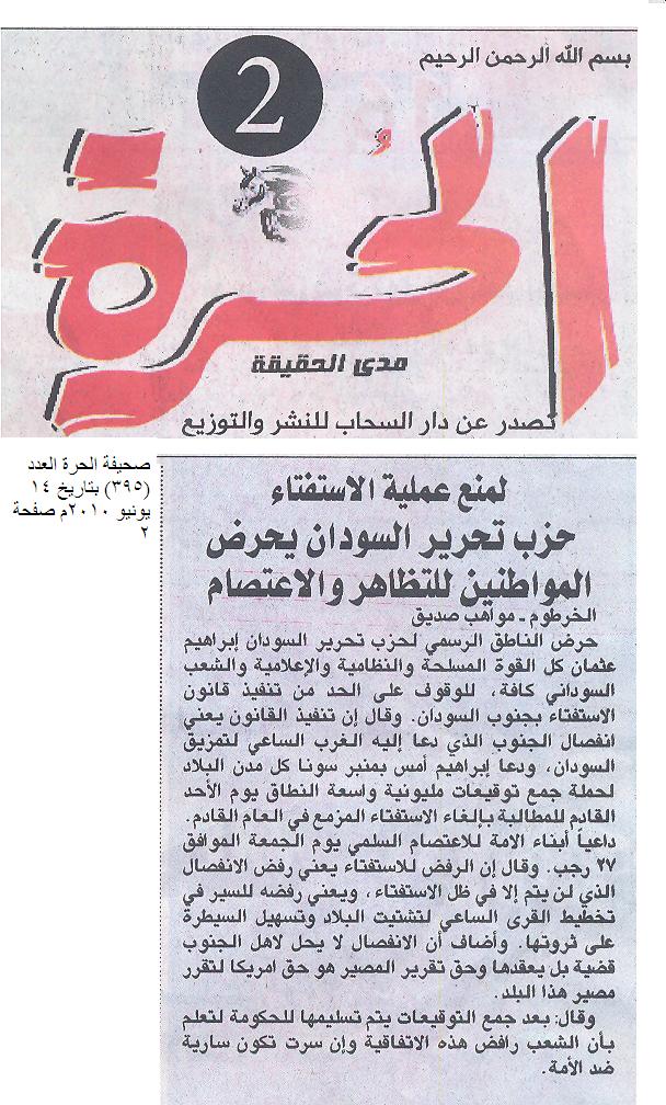 - صحيفة الحرة العدد (395) في الصفحة الثانية أوردت خبراً بعنوان: (لمنع عملية الاستفتاء، حزب تحرير السودان يحرض المواطنين للتظاهر والاعتصام).