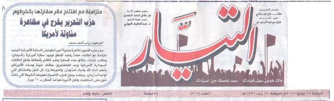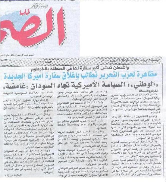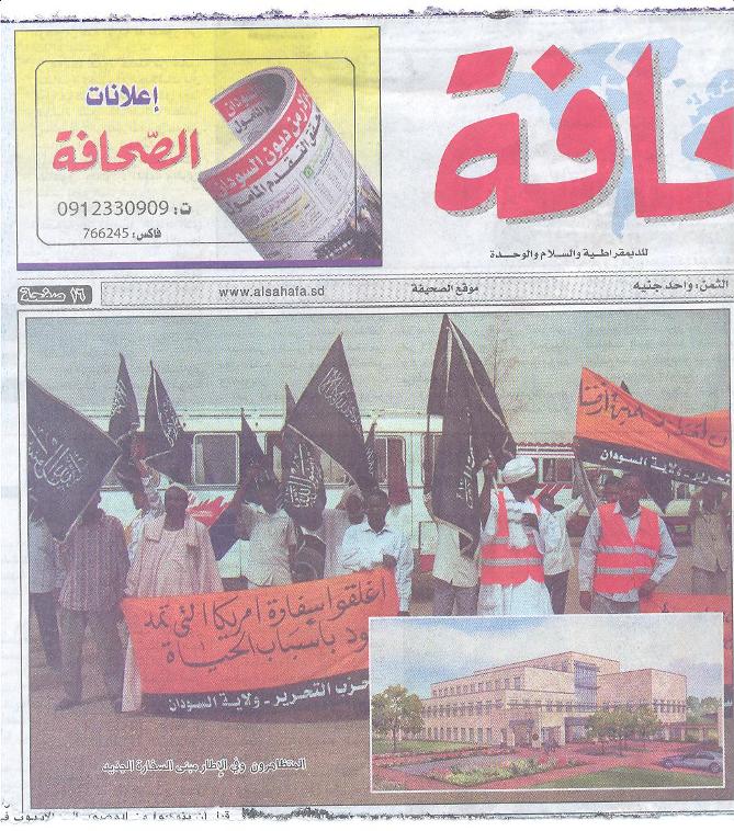 أوردت الصحف السودانية خبر تظاهرة شباب حزب التحرير والتي تطالب بإغلاق السفارة الأمريكية في السودان