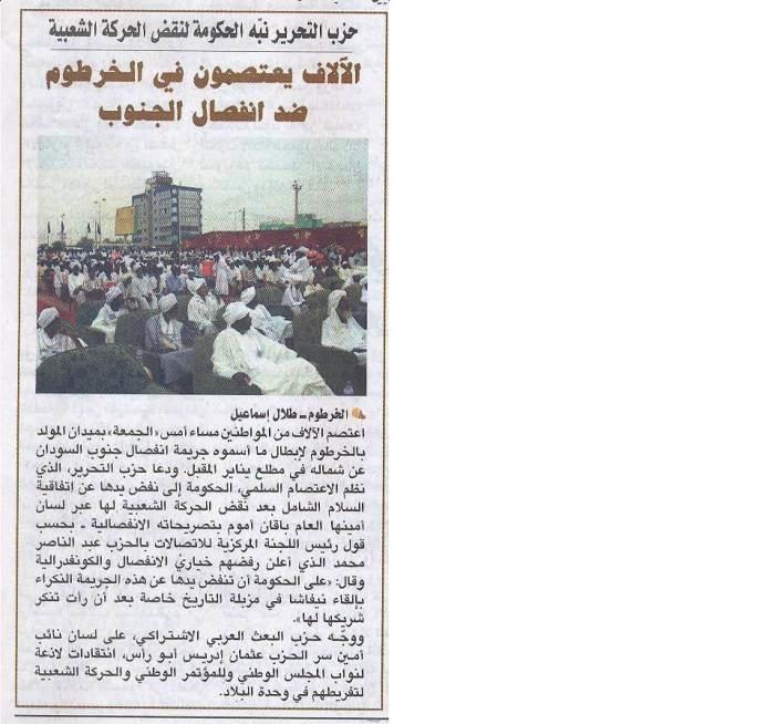 1/ صحيفة الاهرام اليوم العدد (202) يوم السبت 10/07 في الصفحة الأولى خبراً بعنوان: (الآلاف يعتصمون في الخرطوم ضد إنفصال الجنوب).
