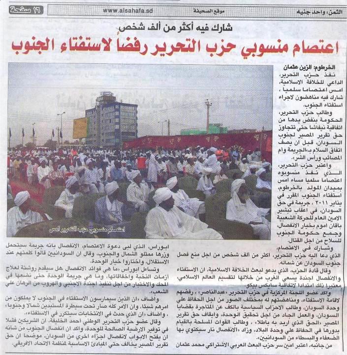 2/ صحيفة الصحافة العدد (6105) يوم السبت 10/07 في الصفحة الأولى تحت عنوان: (شارك فيه أكثر من ألف شخص، اعتصام منسوبي حزب التحرير رفضاً لإستفتاء الجنوب).