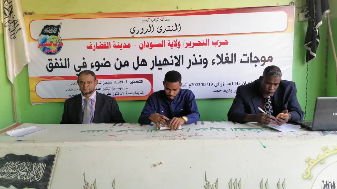 كما أقام شباب حزب التحرير/ ولاية السودان بمدينة القضارف منتداه الدوري الذي جاء بعنوان: "موجات الغلاء ونذر الانهيار هل من ضوء في النفق؟"، بمكتب حزب التحرير بمدينة القضارف بديم حمد يوم السبت 19 آذار/مارس 2022م. تناولت الورقة الأولى التي قدمها الأستاذ سليمان الدسيس، موجات الغلاء المتتالية التي زادت معاناة الناس وأرهقتهم، حيث أجمل أسبابها في تطبيق النظام الرأسمالي المتمثل في ربط العملات بالدولار الذي في حقيقته ورقة لا تساوي إلا قيمة الحبر الذي طبعت به، فرضتها أمريكا على شعوب العالم لنهب ثرواتها. وسياسة تعويم العملة والتي هي من وصفات صندوق النقد الدولي التدميرية المفروضة على حكومة السودان، وكذلك الشركات الكبرى التي تحتكر السلع ما يجعلها المتحكم في أسعارها في عالم الرأسمالية الجشع الذي يضع تعظيم الأرباح أعلى غاياته، والضرائب بشتى أنواعها والجمارك، حيث تضمنت موازنة العام 2022م زيادة في الإيرادات بنسبة 34%. والزيادات المتتالية في أسعار البترول والقمح، حيث بيّن المتحدث أن إنتاج البلاد من البترول وصل إلى 130 ألف برميل تقلص بسبب فشل إدارة موارد البلاد إلى 60 ألف برميل ما جعل البلاد تسد حاجتها من النفط خارجياً.