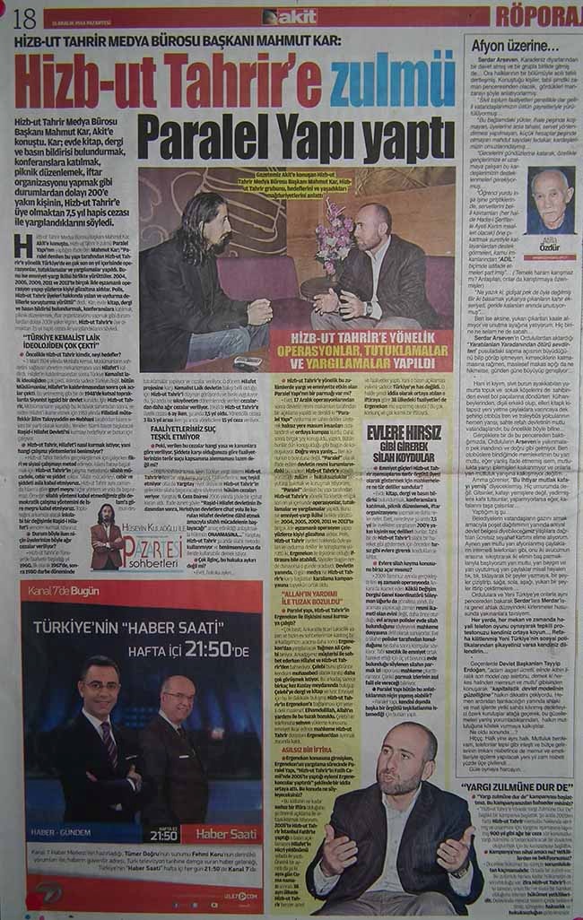 حسنًا، بعد عمليات 17 كانون الأول/ديسمبر، صرحت سلطات الدولة الرسمية بقولها إن المنظمات الموازية قد عاقبت الناس الأبرياء من خلال استخدام أدلة كاذبة وملفقة، وهذا بدوره قد أوجد مؤامرة ضد الجيش. وبعد ذلك تمت مناقشة الكثير من الأمور والكتابة حولها. ولا تزال كل هذه القضايا تخضع للنقاش اليوم كما كانت بالأمس. سواء أكانت صحيحة أم لا ... أنا لا أريد أن أنظر لهذه القضية من خلال هذه الزاوية، وإنما أود أن نلقي نظرة على البعد الذي يوضح الاضطهاد غير القانوني الذي يتعرض له حزب التحرير والذي تقوم به مؤسسة من مؤسسات الحكومة تسمى "متوازية".