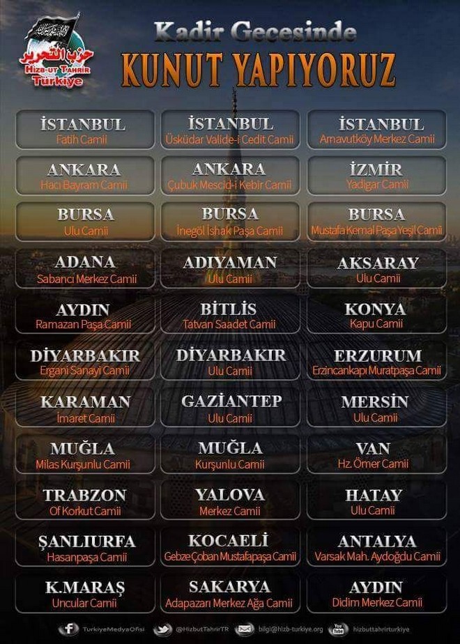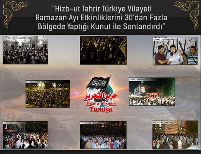 نظم أعضاء وأنصار حزب التحرير / ولاية تركيا ليلة القدر ليلة الـ 27 من شهر رمضان المبارك لعام 1436هـ فعاليات قراءة "دعاء القنوت" في 30 نقطة ومدينة من مدن تركيا، نصرة للمسلمين في تركستان الشرقية وأراكان وسوريا والعراق وفلسطين وفي كل مكان، وابتهلوا إلى الله سبحانه أن يجعل شهر رمضان هذا آخر شهر يحل على المسلمين وهم بدون خليفة راشد يحكمهم بكتاب الله وسنة رسوله صلى الله عليه وسلم، واختتمت الفعاليات في كافة المدن على خير وبركة، والحمد لله رب العالمين.