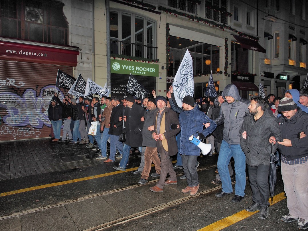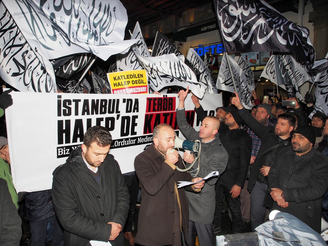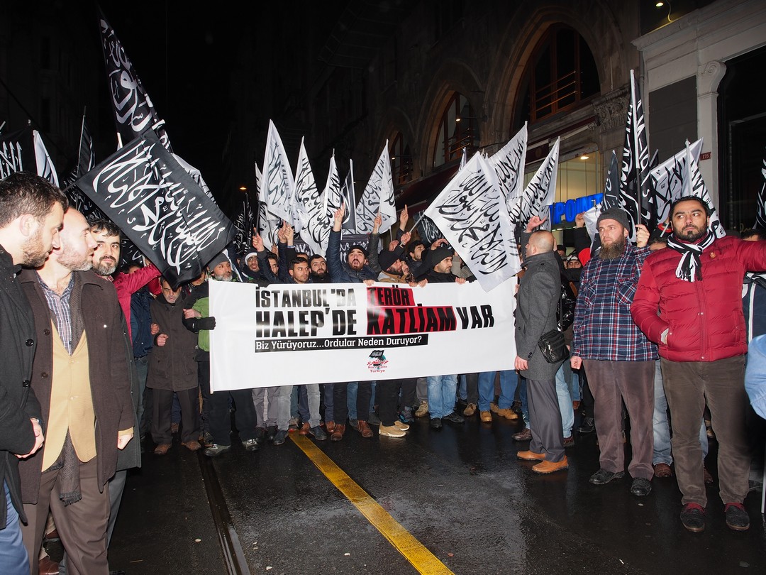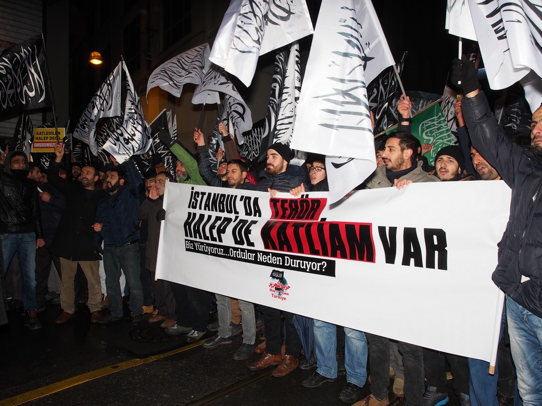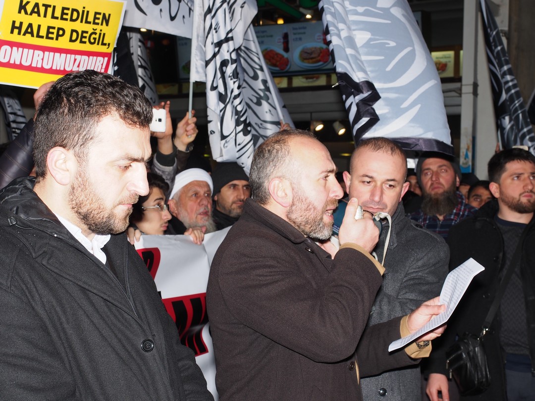نظم حزب التحرير / ولاية تركيا وقفة طارئة أمام القنصلية الروسية في إسطنبول هذه الليلة في تمام الساعة 22:00 مساء نصرة لأهلنا في #حلب التي تباد على مرأى ومسمع العالم دون أن يحرك ساكناً نصرة للمستضعفين فيها، وذلك ضمن سلسلة من الفعاليات والمسيرات التي ينظمها الحزب في أرجاء تركيا تحت شعار "إننا نستنصر لحلب.. فلماذا الجيوش رابضة!".