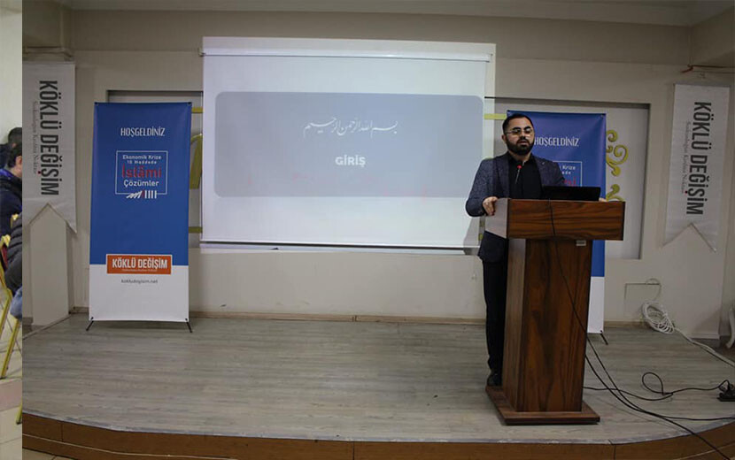 وقدم الأستاذ موسى باي أوغلو عرضاً بعنوان "الحلول الإسلامية للأزمة الاقتصادية في 10 نقاط". بعد العرض التقديمي، عقدت جلسة أسئلة وأجوبة وتم الاستماع إلى تعليقات الضيوف على الحل المطروح. وقدم المشاركون مساهمات قيمة بأسئلتهم وآرائهم وتعليقاتهم، أجاب موسى بايوغلو على الأسئلة المطروحة.