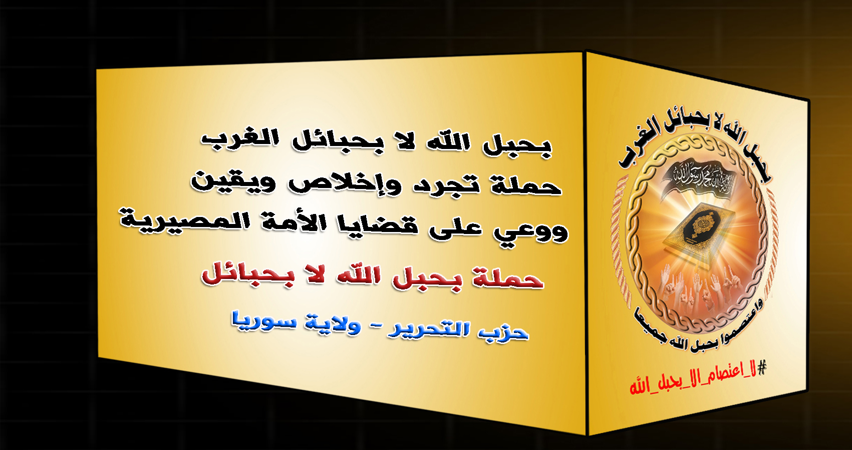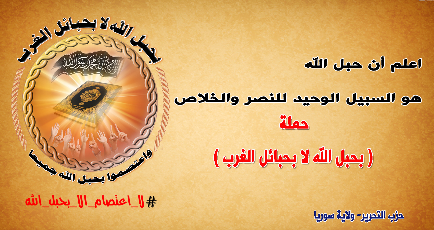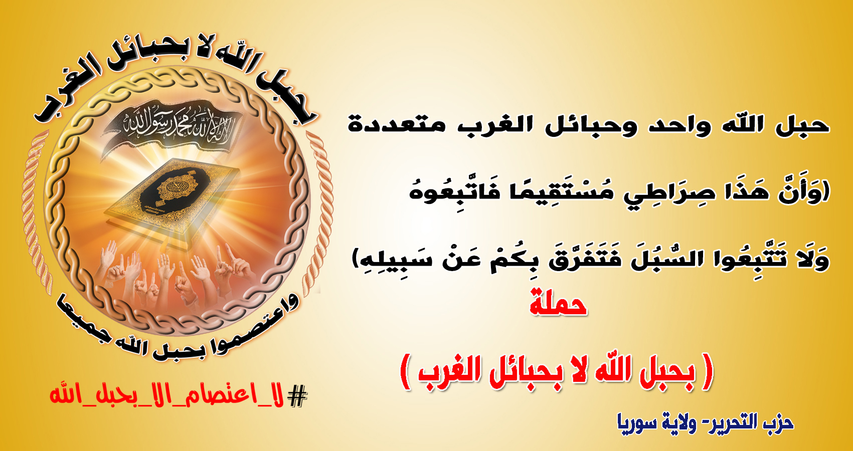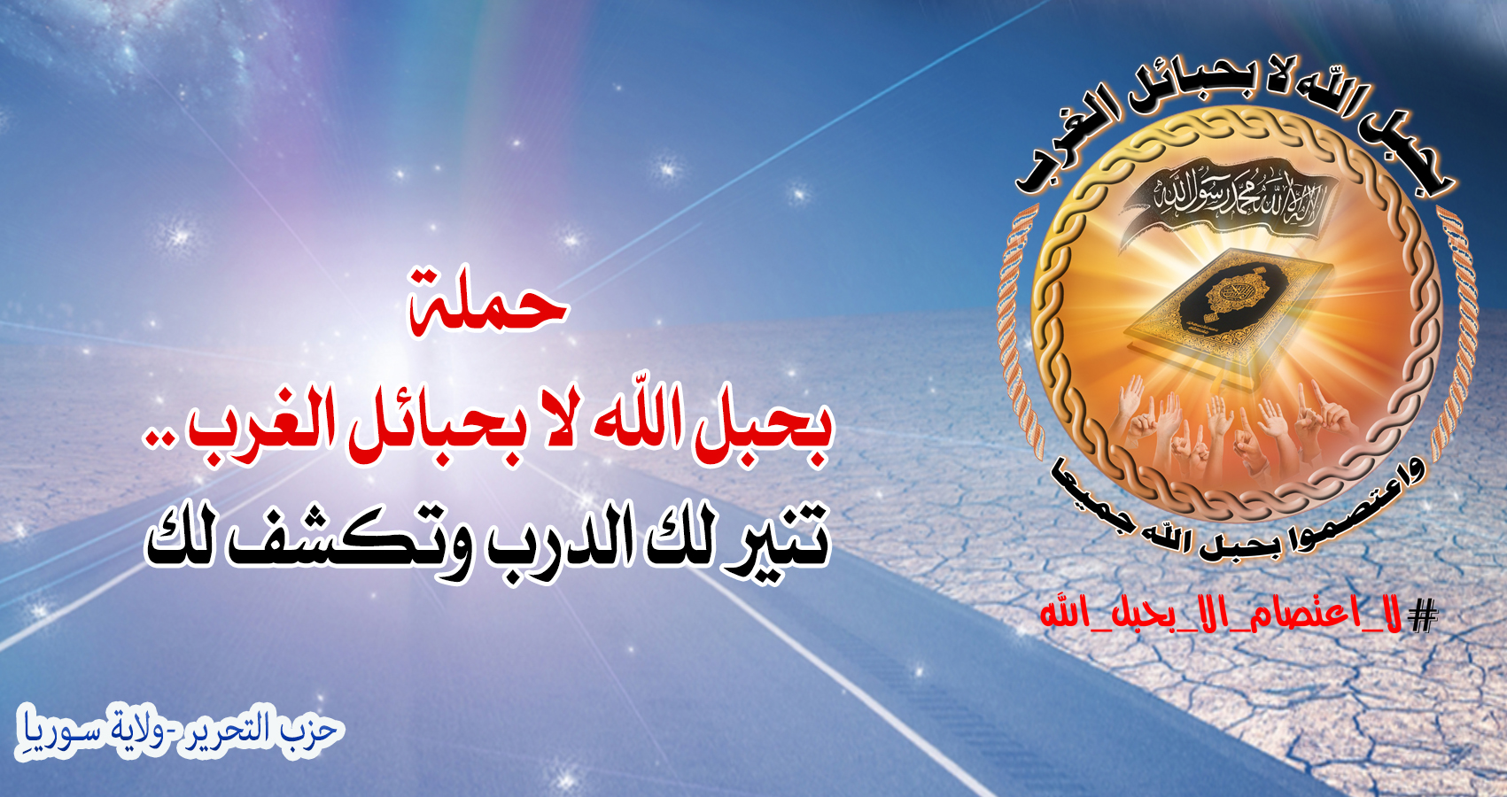 لا شك أن الغرب الكافر يعمل ليل نهار على منع عودة الخلافة الراشدة على منهاج النبوة ويستخدم في ذلك كل أدواته وأساليبه لإجهاض ثورة الشام المباركة وحيث أن الغرب الكافر يعمل على تجميع الفصائل خلف قيادة سياسية عميلة تخوض فيما بعد غمار مفاوضات نقل السلطة للوصول إلى الحل السياسي المعد على الطريقة الأمريكية والذي يجهض ثورة الشام ويهدر تضحيات المسلمين ويثبت العلمانية كنظام مفروض على المسلمين تحت مسمى حل الأزمة وغيرها من المسميات التضليلية، ولهذا كله فإن حزب التحرير / ولاية سوريا يعلن عن إطلاق حملة واسعة بعنوان "بحبل الله لا بحبائل الغرب" لكشف الحقائق وتوحيد الصفوف.