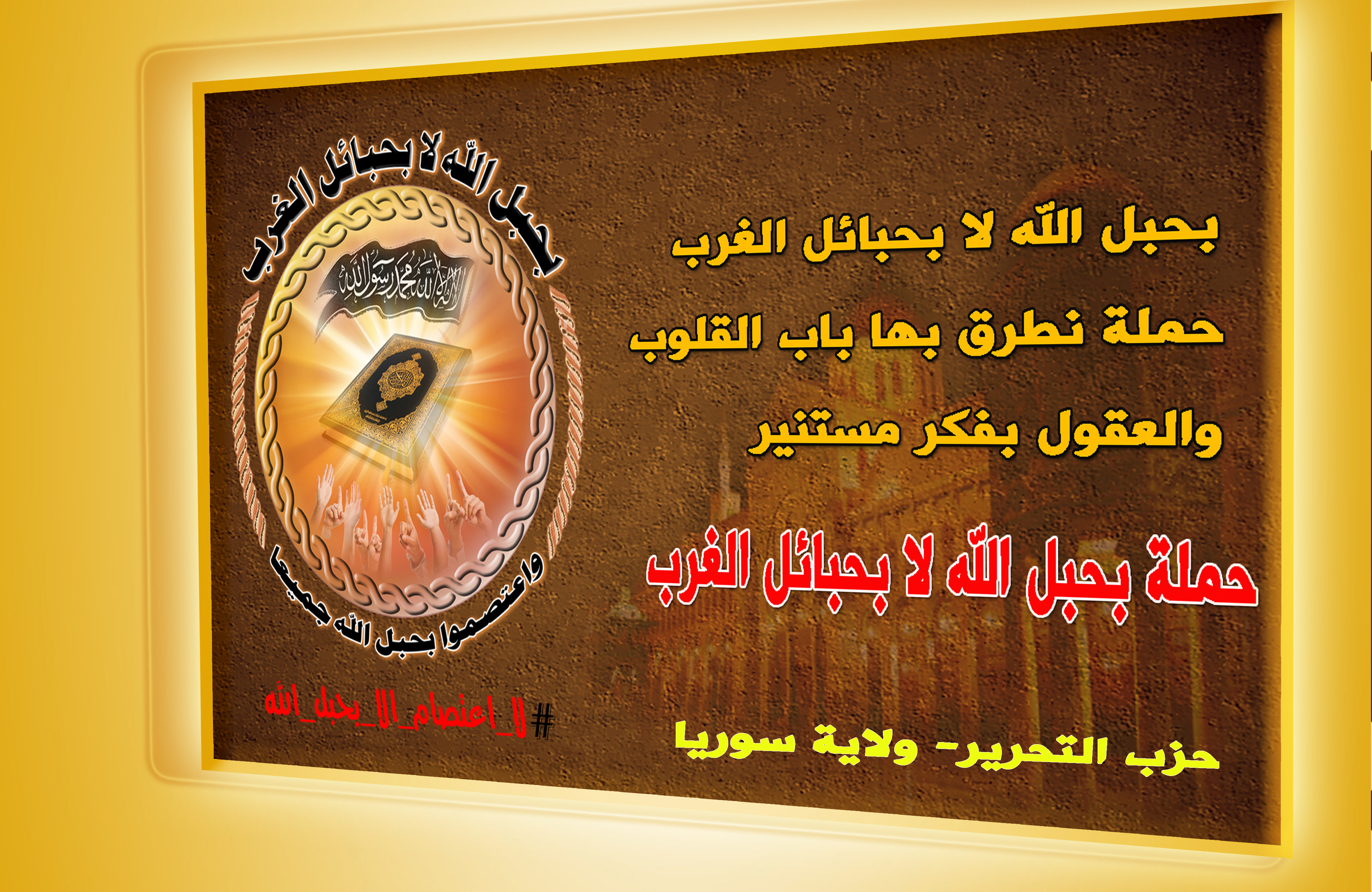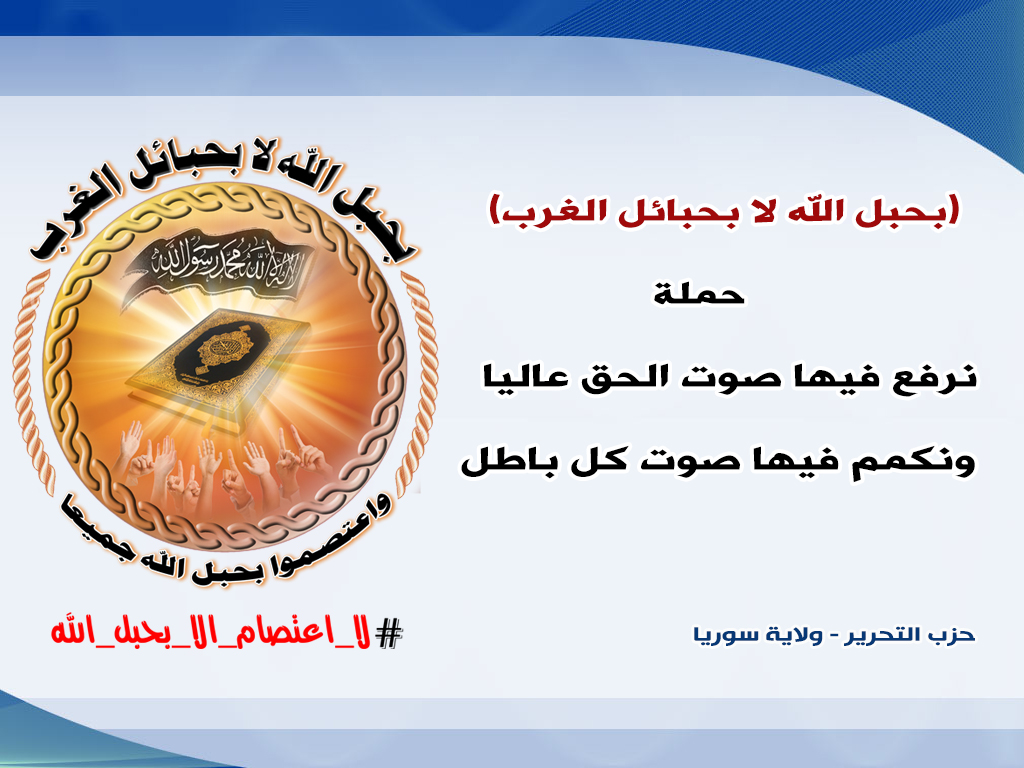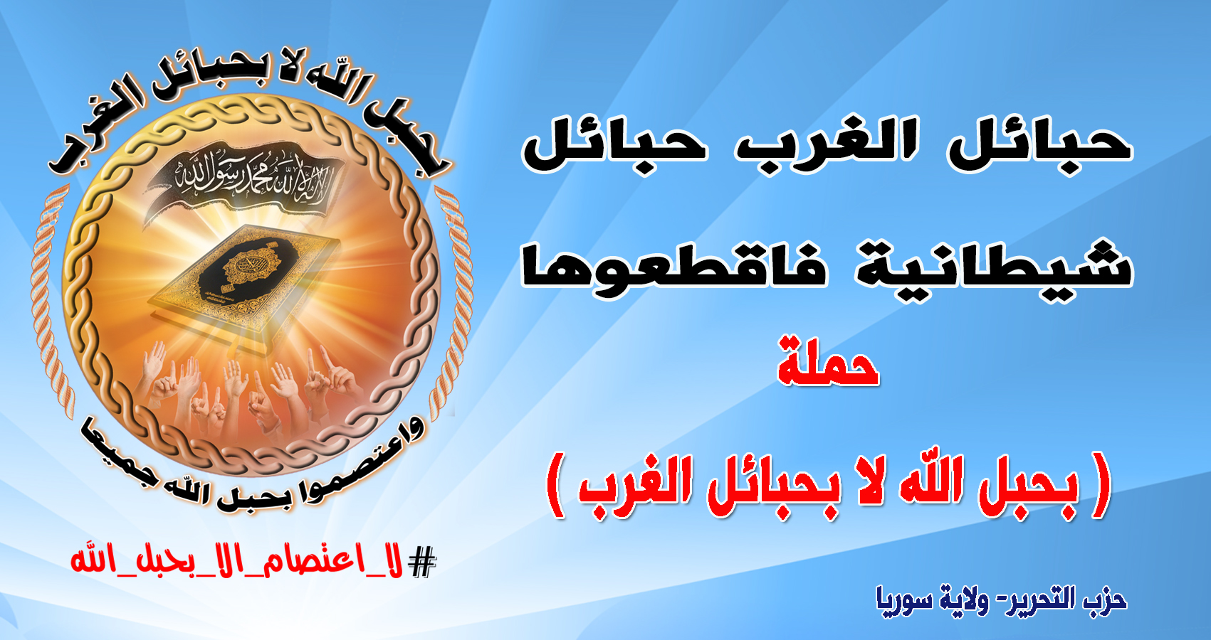 لا شك أن الغرب الكافر يعمل ليل نهار على منع عودة الخلافة الراشدة على منهاج النبوة ويستخدم في ذلك كل أدواته وأساليبه لإجهاض ثورة الشام المباركة وحيث أن الغرب الكافر يعمل على تجميع الفصائل خلف قيادة سياسية عميلة تخوض فيما بعد غمار مفاوضات نقل السلطة للوصول إلى الحل السياسي المعد على الطريقة الأمريكية والذي يجهض ثورة الشام ويهدر تضحيات المسلمين ويثبت العلمانية كنظام مفروض على المسلمين تحت مسمى حل الأزمة وغيرها من المسميات التضليلية، ولهذا كله فإن حزب التحرير / ولاية سوريا يعلن عن إطلاق حملة واسعة بعنوان "بحبل الله لا بحبائل الغرب" لكشف الحقائق وتوحيد الصفوف.