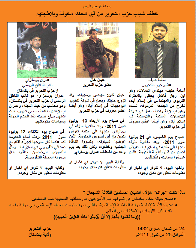 حيان خان: مهندس برمجيات، وقد تزوج حديثا، ويعمل في شركة لتطوير البرمجيات في إسلام أباد، وهو أيضا عضو معروف في حزب التحرير.