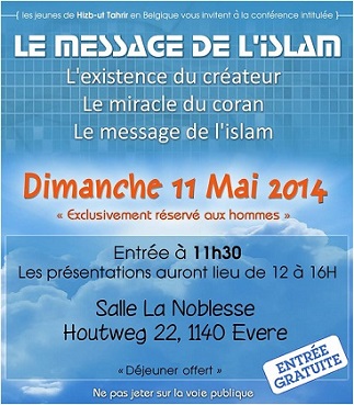تم بحمد الله اليوم الأحد الثاني عشر من رجب سنة 1435هـ الموافق لـلحادي عشر من أيار/مايو سنة 2014م، عقد ندوة جامعة نظمها شباب حزب التحرير / بلجيكا بالعاصمة بروكسيل تحت عنوان "رسالة الإسلام"، وقد قدم المحاضرون ثلاث ورقات باللغة الفرنسية بينوا فيها للحاضرين أموراً أساسية تصب في صلب العقيدة الإسلامية والأسس التي من أجلها جاء الإسلام.