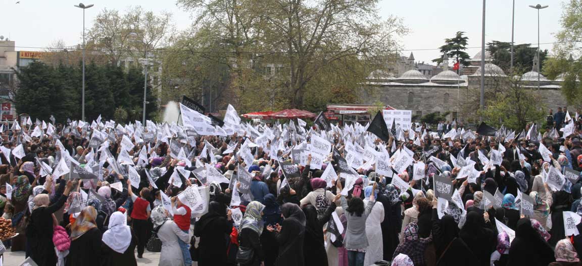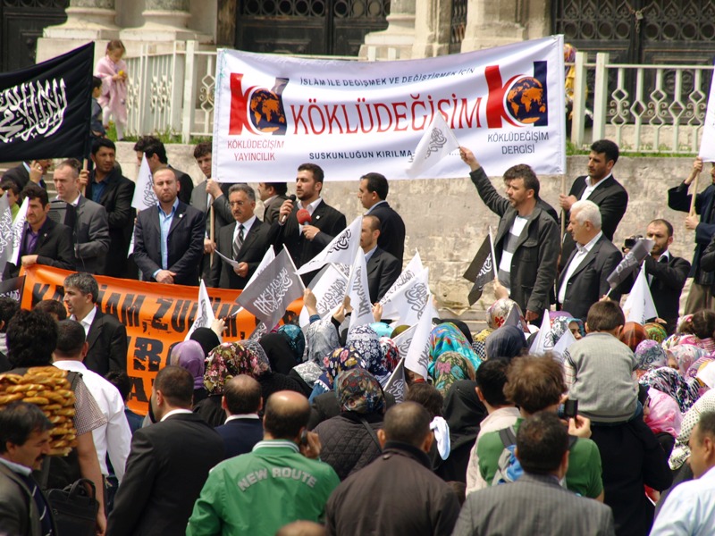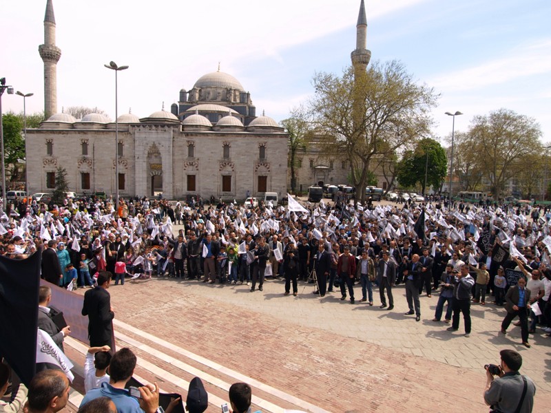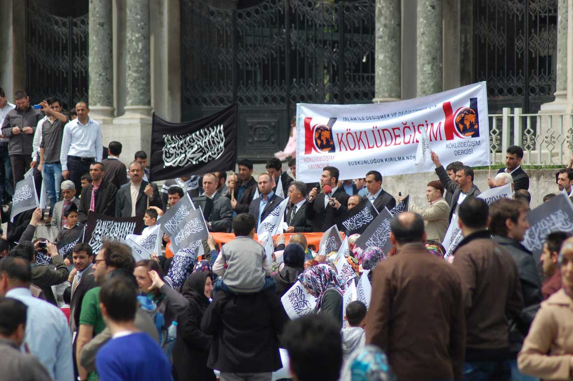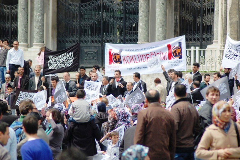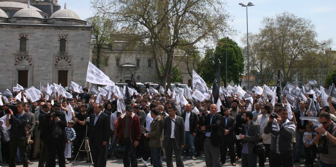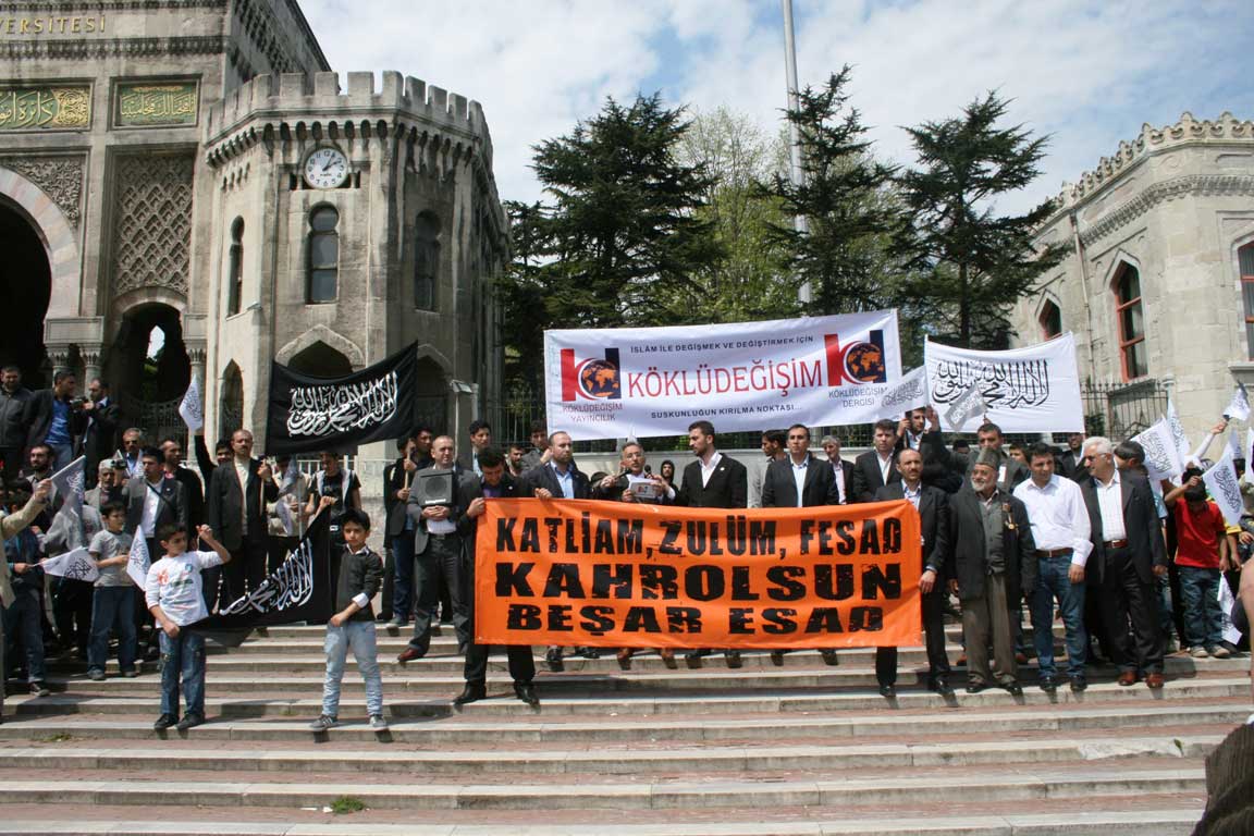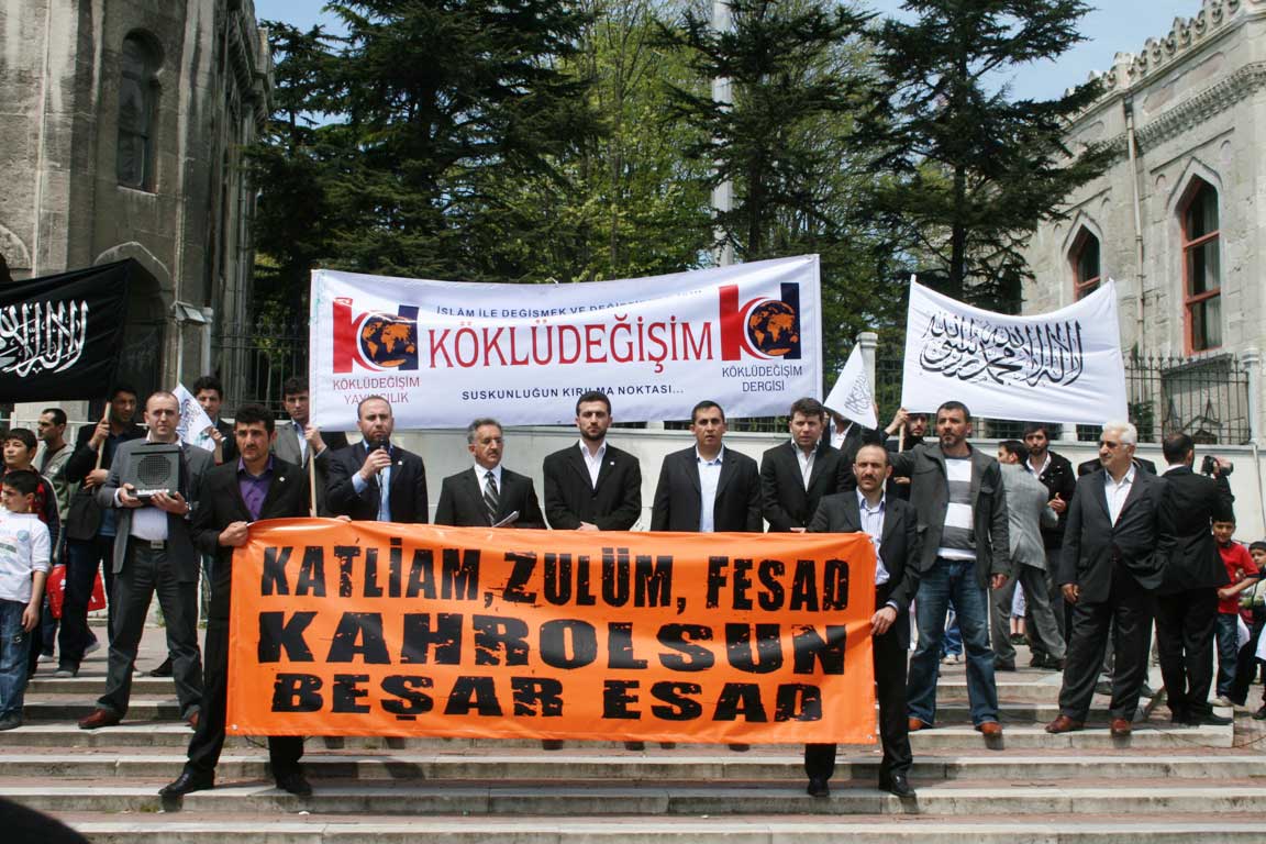 بحمد الله وفضله نظمت مجلة التغيير الجذري التي يصدرها شباب حزب التحرير في ولاية تركيا اليوم الأحد الموافق 05 جمادى الآخرة 1432 هـ - 08 أيار/مايو 2011م عقب صلاة الظهر مباشرة اعتصاماً حاشداً في ساحة جامع بايزيد في اسطنبول بعنوان "فلتوقف مجازر ظالم سوريا/الأسد"؛ وذلك للتنديد بالمجازر الوحشية التي يقترفها النظام السوري تجاه المسلمين العزل في سوريا. وقد شارك نحو أربعة آلاف مسلم ومسلمة في هذه الفعاليات التي نظمتها المجلة والتي شارك فيها تحت مظلتها عدد من الجمعيات والأوقاف والمؤسسات الإسلامية منها: جمعية أُزغُر دِر (Özgür Der) ووقف أكداف (Akdav) ومؤسسة إغاثة حقوق وحريات الإنسان (İHH)، حيث رفع المشاركون رايات العقاب السوداء رايات دولة الخلافة والألوية البيضاء وأطلقوا التكبيرات وحملوا يافطات تندد بالمجازر الوحشية التي يرتكبها نظام الأسد الطاغوتي تجاه إخواننا المسلمين في سوريا. وقد حملت اليافطات والشعارات التي رفعت خلال الاعتصام عبارات جاء فيها: "مجازر، ظلم، فساد، قهراً لك بشار الأسد"، "لا إله إلا الله، الخلافة وعد الله".