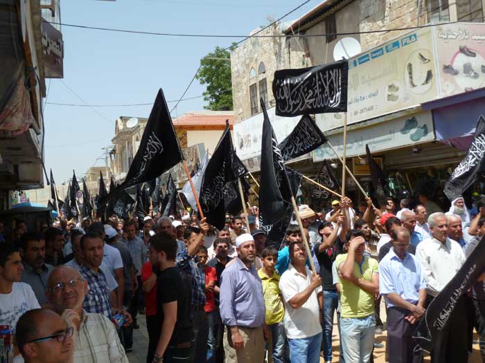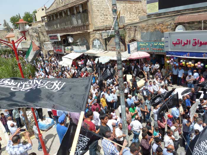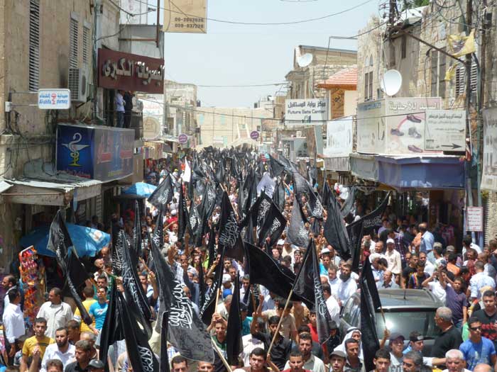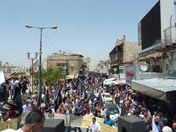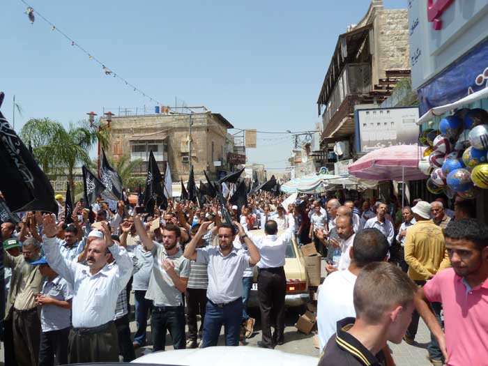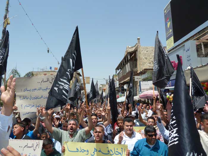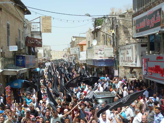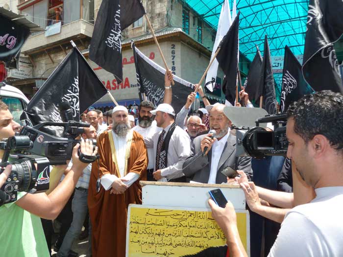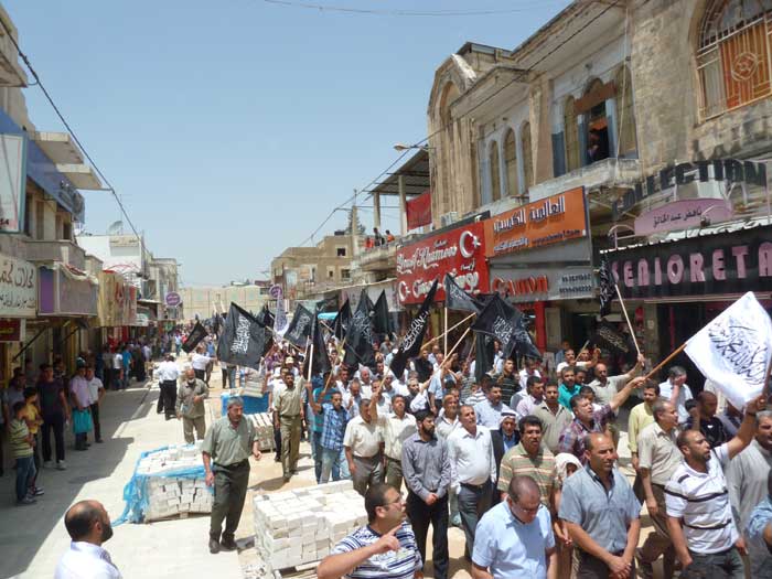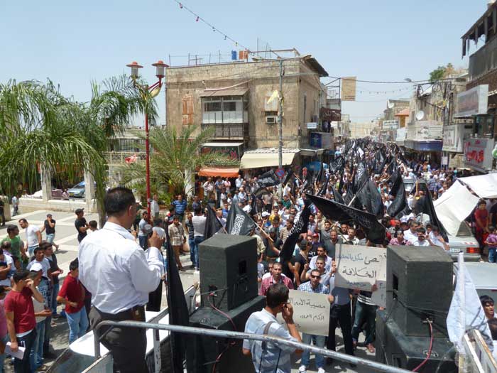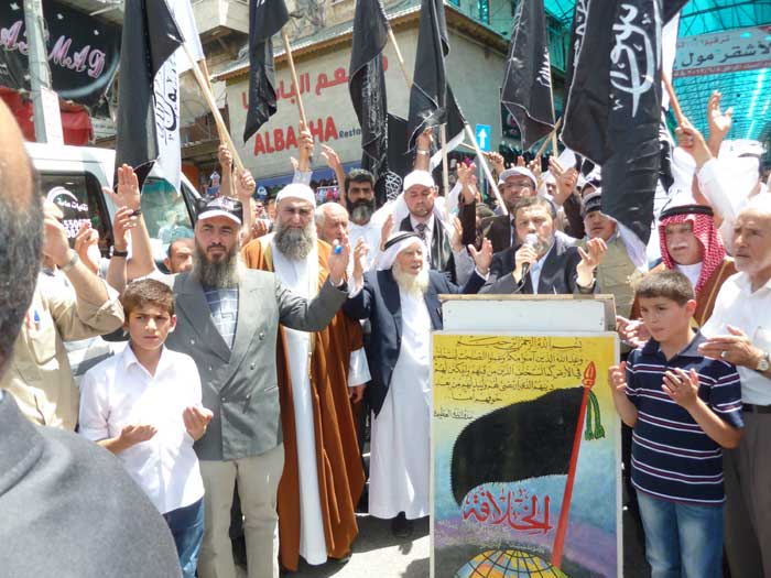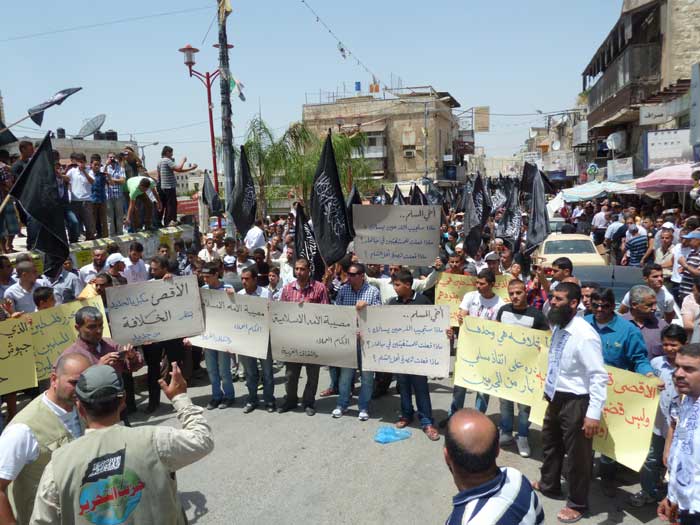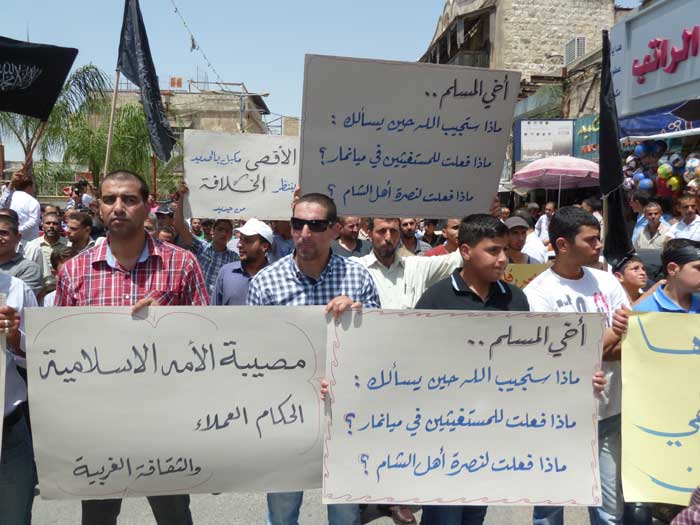 ورفع المشاركون شعارات تطالب باستعادة الخلافة وتدعو لنصرة مسلمي سوريا، ورددوا هتافات تطالب الجيوش بالتحرك ونصرة المسجد الأقصى المبارك، من مثل "يا جيوش المسلمين...هبوا لنصرة الدين" و"يا جيوش المسلمين...أنقذوا الأقصى الحزين" و "من الاقصى الى الشام ...أمة وحدة ما بتنضام".