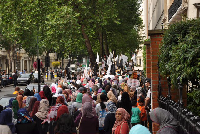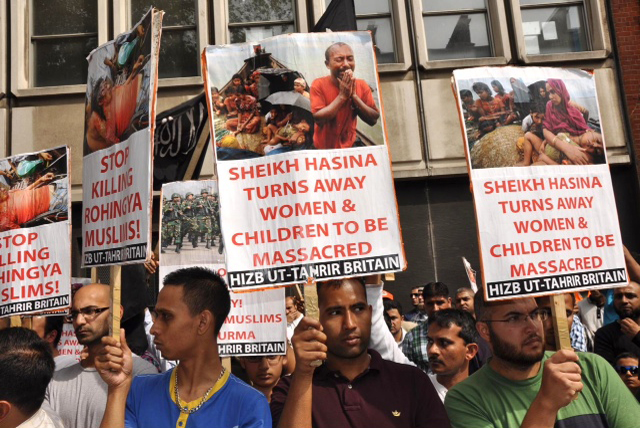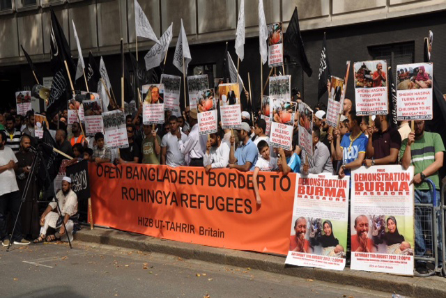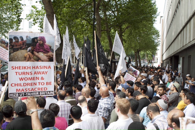 لندن، المملكة المتحدة، الحادي عشر من آب/أغسطس 2012 - احتشد مئات المسلمين أمام مبنى المندوب السامي لبنغلادش في لندن للاحتجاج على إغلاقِ حكومة الشيخة حسينة حدود بنغلادش في وجه مسلمي الروهينجيا الهاربين من الاضطهاد الوحشي في بورما (مينامار). وقد تمّ تنظيم المظاهرة من قِبل حزب التحرير في بريطانيا.