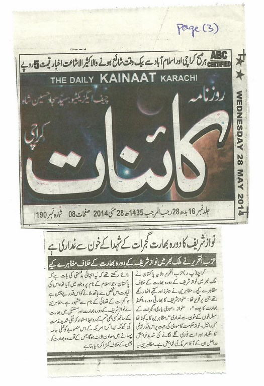 وقد ندّد المتظاهرون بفرح نظام رحيل / نواز الكبير بفوز مودي وحرصه على احتضانه؛ لأن سيدتهم أمريكا تريد منه فعل ذلك. وأكّدوا على أنه من المؤسف جدًا أن قيادة هذا البلد الذي تم إنشاؤه باسم الإسلام حريصة كل الحرص على مصافحة الرجل المعروف باسم "جزار جوجرات"!