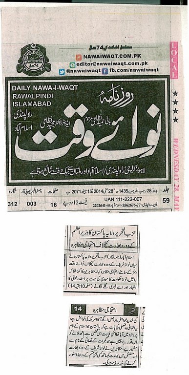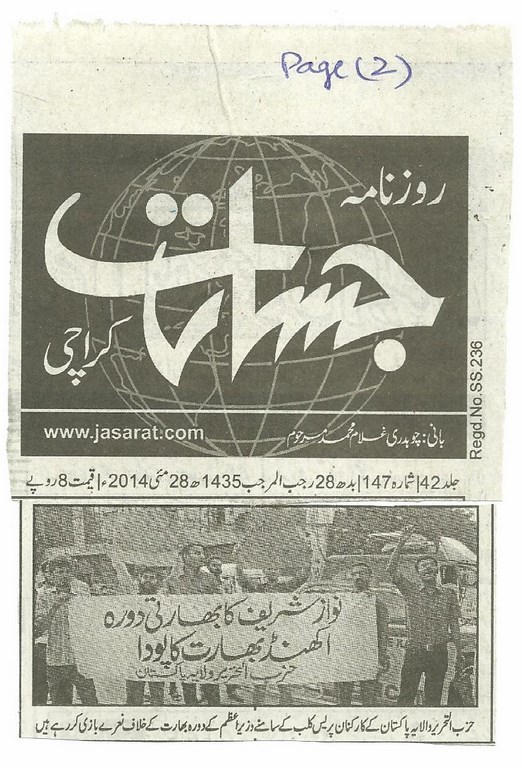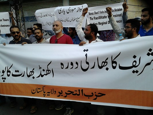 نظّم حزب التحرير / ولاية باكستان مظاهرات في أنحاء باكستان ضد زيارة نواز شريف للهند، وقد رفع المتظاهرون لافتات كُتب عليها: "زيارة نواز شريف للهند هي زرع لبذور الهيمنة الهندية"، و"صداقة نواز ومودي هي خيانة لدماء المسلمين في جوجرات".