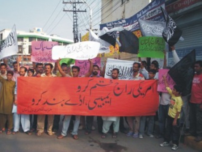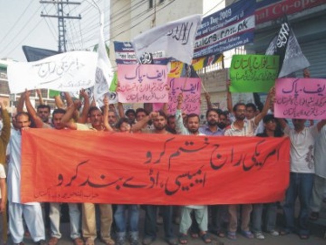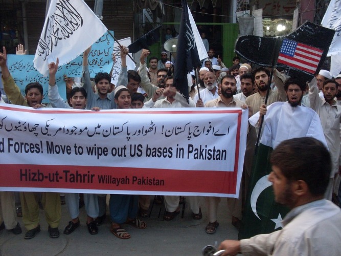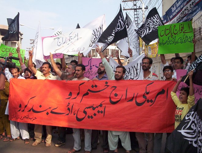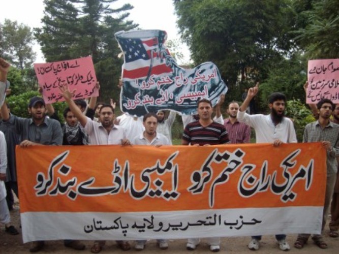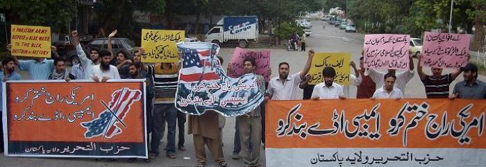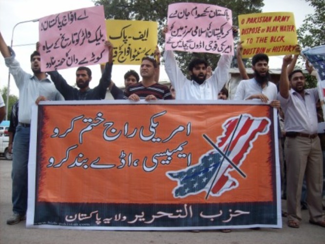 نظم حزب التحرير مظاهرات احتجاجية في إسلام أباد وكراتشي ولاهور وبيشاور حمل المتظاهرون فيها يافطات اتخذت شكل حذاء مكتوب عليها شعار "اقضوا على الاحتلال الأمريكي وأغلقوا القواعد العسكرية والسفارة الأمريكية". وقد كانت الغاية من حمل تلك اليافطات التأكيد للناس على إمكانية إنهاء الوجود الأمريكي في البلاد بركله بالحذاء. إذ إن الحذاء أصبح "رمزاً وطنياً" للولايات المتحدة الأمريكية بعد أن ضُرب به بوش في العراق. نُظمت هذه المظاهرات خارج النوادي الصحفية في كل من كراتشي ولاهور وأمام المكتب الصحفي في إسلام أباد وفي سوق قاسي كواني في بيشاور.
