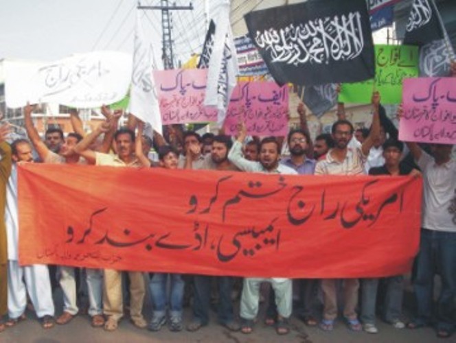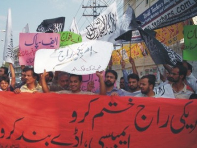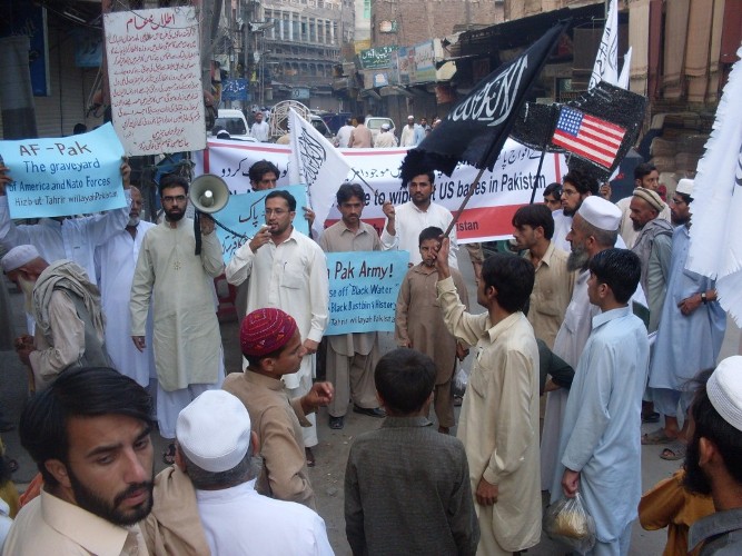 حمل المتظاهرون يافطات أخرى كُتب عليها "أفغانستان وباكستان قبور لأمريكا والنيتو"، "أيتها القوات المسلحة! انهضوا للقضاء على القواعد العسكرية الأمريكية في باكستان". وقد هتف المتظاهرون بهتافات ضد تلك القواعد وضد شركة Black Water. هذا وقد خطب بالمتظاهرين أعضاء من حزب التحرير طالبوا بإغلاق القواعد العسكرية والسفارة الأمريكية التي اتخذت شكل القاعدة تحت ذريعة توسيع السفارة. كما طالبوا بركل الوجود الأمريكي من المنطقة، فأمريكا هي سبب الشر في المنطقة، فالجميع يعي بأنّه لم يكن هناك بذرة للشر والإرهاب في المنطقة قبل قدوم القوات الأمريكية وأجهزة مخابراتها. أما الآن فإنّ أمريكا تستخدم الأسلوب الذي استخدمته في العراق إذ تقوم بالعمليات التفجيرية في البلاد إلى جانب تحريضها على قتل المسلم لأخيه المسلم في منطقة القبائل لكي تخفف بذلك من الضغط على جنودها جراء وطأة عمليات المقاومة في أفغانستان.