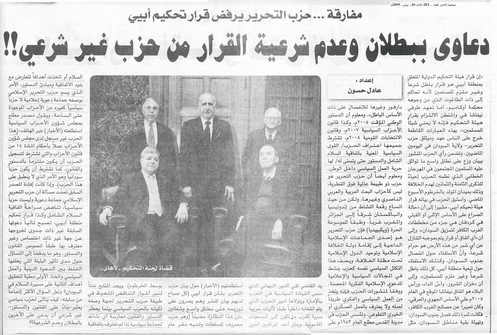 طالعنا بصحيفتكم الأخبار العدد (283) بتاريخ اليوم الأحد 4 شعبان 1430هـ الموافق 26 يوليو2009م تحت عنوان: (مفارقة... حزب التحرير يرفض قرار تحكيم لاهاي- دعاوى ببطلان وعدم شرعية القرار من حزب غير شرعي)!! مقالة كتبها الأستاذ/ عادل حسون، وقد وصف الكاتب الحزب بعدم الشرعية، واستنكر عليه قوله ببطلان نيفاشا وعدم شرعية الدستور الذي قام عليه، وكذلك التحاكم إلى لاهاي.