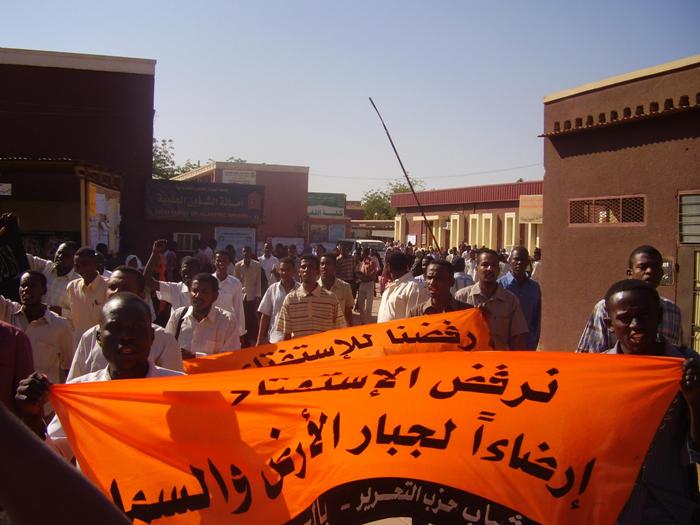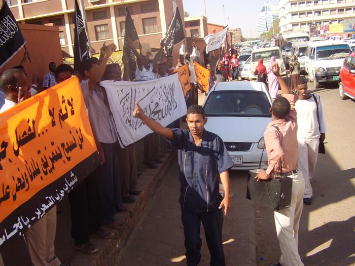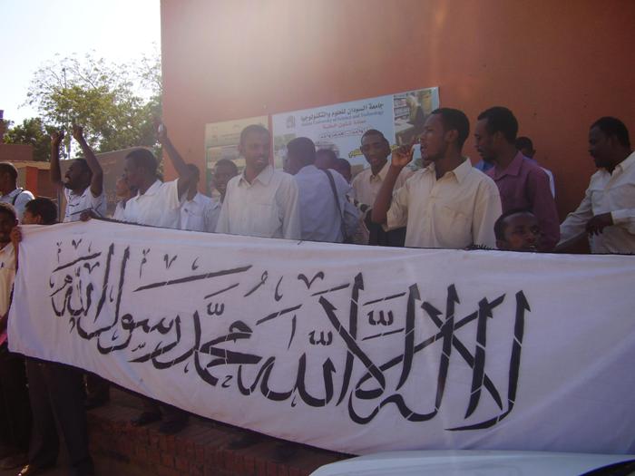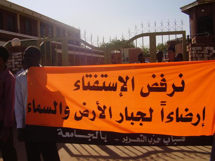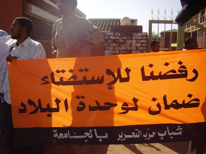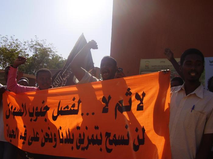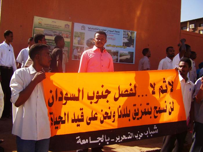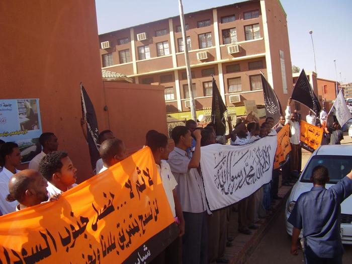 قام شباب حزب التحرير- ولاية السودان في الجامعات باعتصام أمام جامعة السودان للعلوم والتكنولوجيا -الجناح الغربي- بعد مخاطبة قاموا بها داخل الجامعة بعنوان: (انفصال جنوب السودان مسؤولية من؟!)، وقد خاطب الأخ/ عبد الرحمن سعد حشود الطلاب المشاركين في الاعتصام، متحدثاً باسم شباب حزب التحرير في الجامعات، مرسلاً عبر حديثه رسالتين: