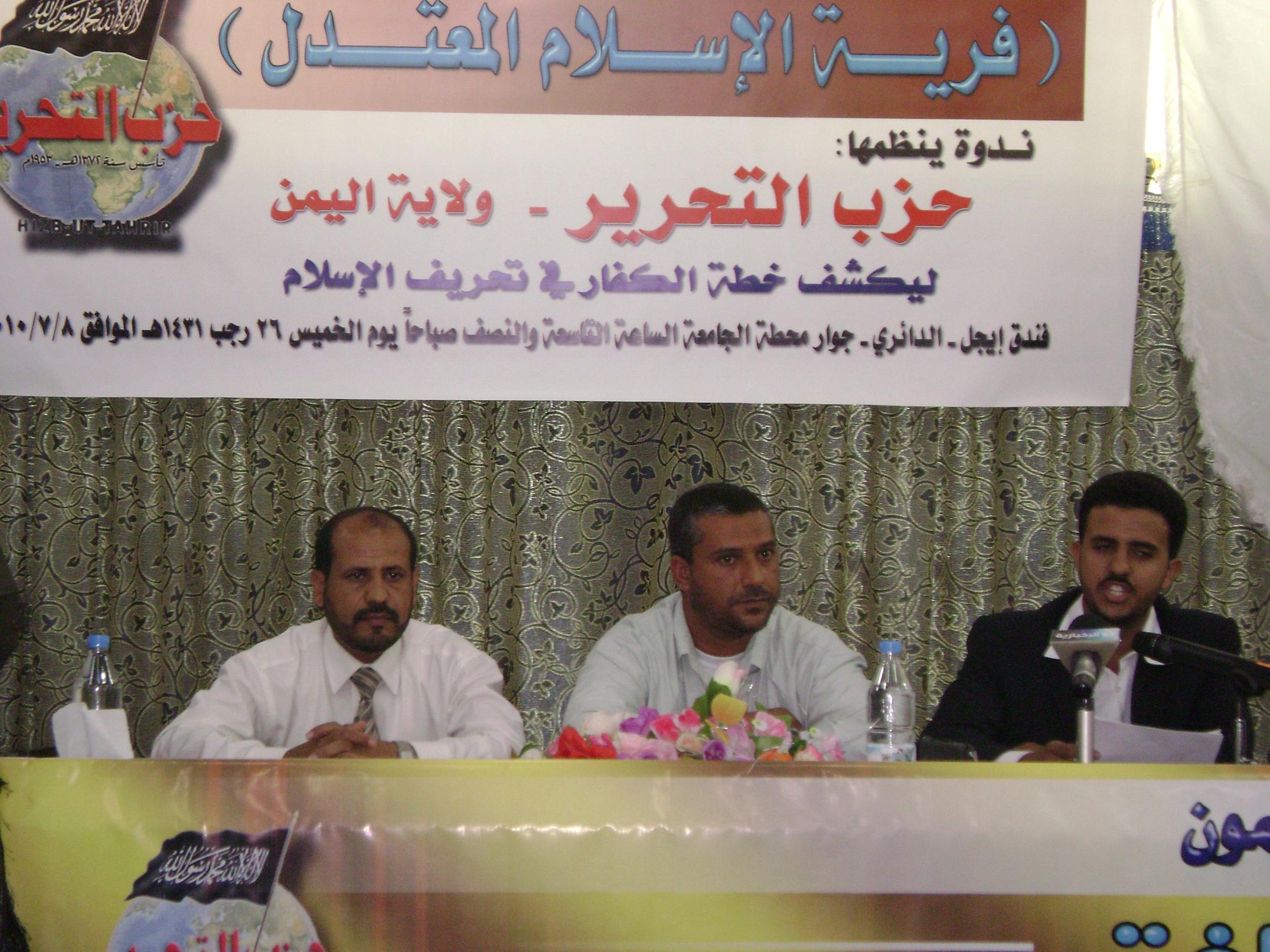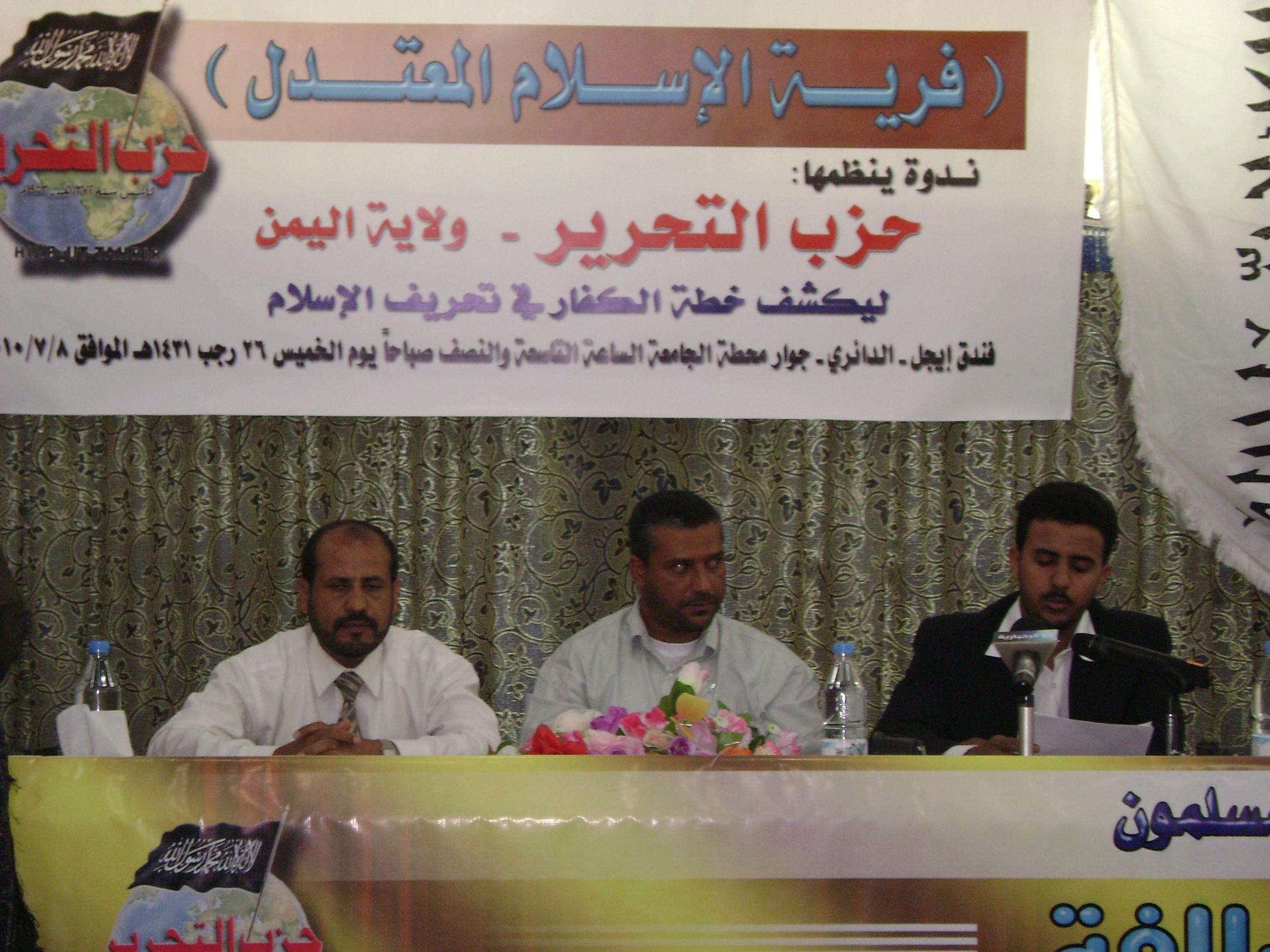 أنهى حزب التحرير-ولاية اليمن ندوته تحت عنوان "فرية الإسلام المعتدل" بحضور فعاليات من مجلس النواب ومشائخ قبائل وأحزاب وصحفيين وكتاب، حيث بين المحاضرون مفهوم (الإسلام المعتدل) بأنه افتراء على الإسلام والمسلمين، وتشويه للإسلام، وتمزيق للمسلمين، وإشعال لنار الحرب بينهم، وتطرقوا لخطر الدعوة إلى هذه الأفكار، وكيف أوصت الدراسات الأمريكية لإيجاد الإسلام المعتدل بدلا من المتشدد، وخاصة دراسات مؤسسة "راند" الأمريكية، وحذر المحاضرون المسلمين من الانجرار وراء تلك الدعوات، موضحين مفاهيم "الوسطية" و"الاعتدال" و"الغلو" و"التشدد" و"التطرف"، داعين النظام الحاكم في اليمن إلى الاعتدال الحقيقي وهو الاستقامة على شرع الله تعالى، وحكم أهل اليمن بالإسلام بدلا من العلمانية والجمهورية والديمقراطية، وشارك الحاضرون بالعديد من المداخلات والكلمات والأسئلة التي أجاب عليها المحاضرون بكل صدق وشفافية، وخاصة ما يتعلق بالحزب وأفكاره وطريقته، وتميزه عن غيره من الأحزاب والحركات الإسلامية، وخرجت الندوة بالعديد من المفاهيم الهامة التي أنارت عقول الحضور، ونالت إعجابهم.
