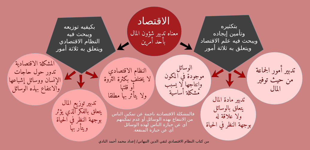 "وَعَلَيهِ فَلَيسَ المَقصُودُ هُنَا مِنْ كَلِمَةِ "اقتِصَاد" المَعنَى اللُّغَوِيَّ وَهُوَ التَّوفِيرُ، وَلا مَعنَى المَالِ، وَإِنَّمَا المَقصُودُ هُوَ المَعنَى الاصطِلاحِيُّ لِمُسَمَّىً مُعَيَّنٍ، وَهُوَ تَدبِيرُ شُؤُونِ المَالِ، إِمَّا بِتَكثِيرِهِ وَتَأمِينِ إِيجَادِهِ، وَيَبحَثُ فِيهِ عِلْمُ الاقتِصَادِ، وَإِمَّا بِكَيفِيَّةِ تَوزِيعِهِ، وَيَبحَثُ فِيهِ النِّظَامُ الاقتِصَادِيُّ. وَإِنَّهُ وَإِنْ كَانَ عِلْمُ الاقتِصَادِ، وَالنِّظَامُ الاقتِصَادِيُّ، كُلٌّ مِنهُمَا يَبحَثُ فِي الاقتِصَادِ وَلَكِنَّهُمَا شَيئَانِ مُختَلِفَانِ مُتَغَايِرَانِ، وَمَفهُومُ أحَدِهِمَا غَيرُ مَفهُومِ الآخَرِ.
