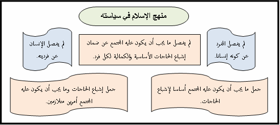"وَمِنْ ذَلِكَ يَتَبَيَّنُ أنَّ الإِسلامَ لَمْ يَفْصِلِ الفَردَ عَنْ كَونِهِ إِنسَانًا، وَلَمْ يَفصِلْهُ كَإِنسَانٍ عَنْ فَردِيَّتهِ. وَلَمْ يَفصِلْ اعتِبَارَ مَا يَجِبُ أنْ يَكُونَ عَلَيهِ المُجتَمَعُ عَنْ ضَمَانِ إِشبَاعِ الحَاجَاتِ الأسَاسِيَّةِ لِكُلِّ فَردٍ، وَتَمكِينِهِ مِنْ إِشبَاعِ حَاجَاتِهِ الكَمَالِيَّةِ، بَلْ جَعَلَ إِشبَاعَ الحَاجَاتِ وَمَا يَجِبُ أنْ يَكُونَ عَلَيهِ المُجتَمَعُ أمرَينِ مُتَلازِمَينِ، لا يَنفَصِلُ أحَدُهُمَا عَنِ الآخَرِ، وَلَكِنْ بِحَيثُ يَجعَلُ مَا يَجِبُ أنْ يَكُونَ عَلَيهِ المُجتَمَعُ أسَاسًا لإِشبَاعِ الحَاجَاتِ.