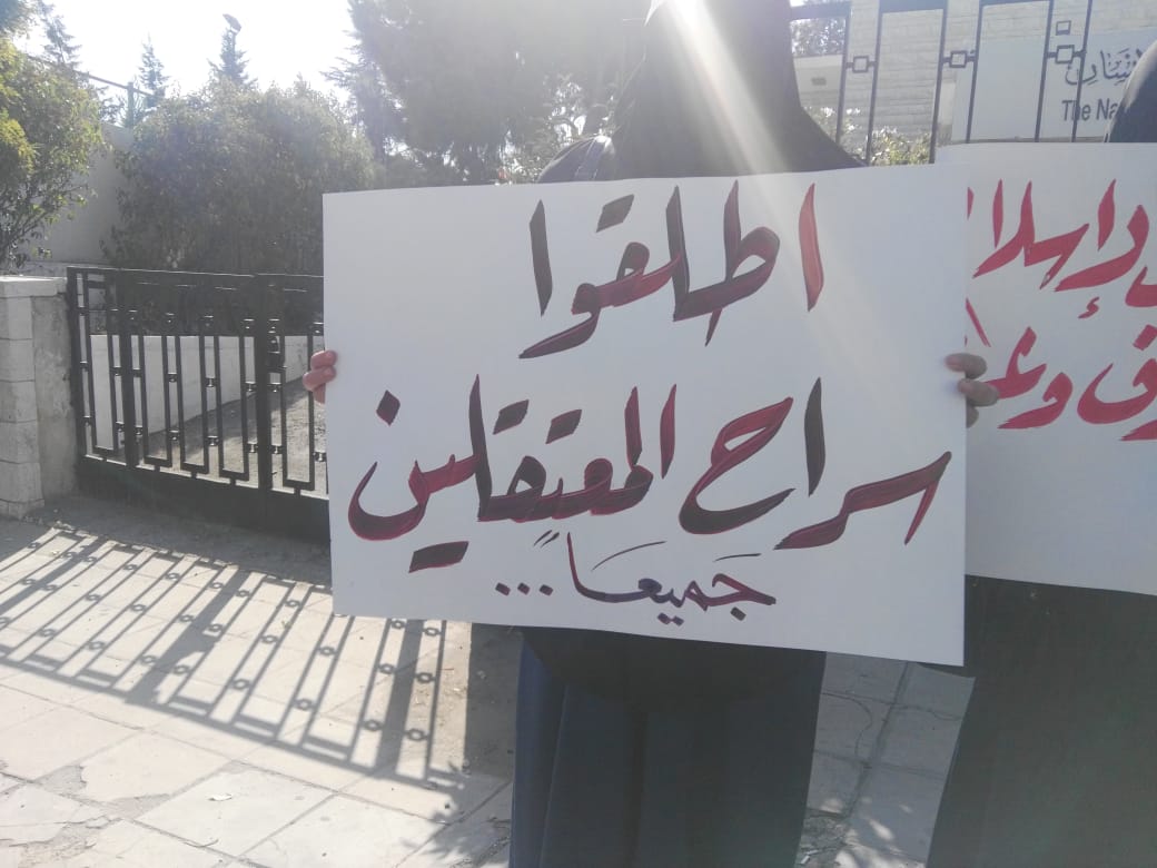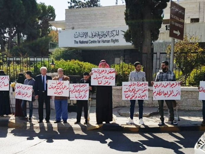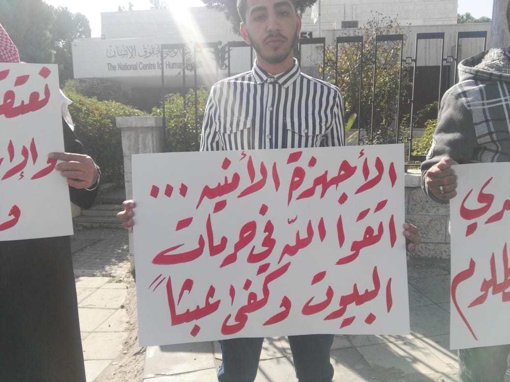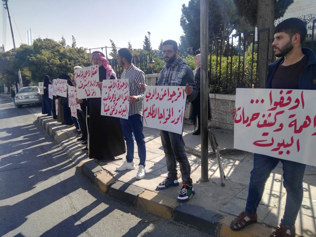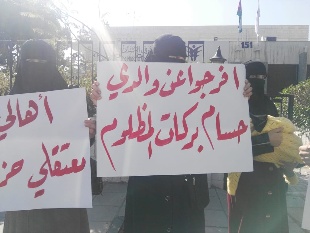 أقام أهالي معتقلي حزب التحرير وقفة احتجاجية اليوم الأحد أمام المركز الوطني لحقوق الإنسان في العاصمة عمان، منددين بما قالوا إنه "انتهاك لحرمات البيوت من خلال الاعتقالات المفاجئة، واقتحام منازل المطلوبين السياسيين بدون استئذان".