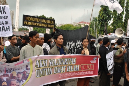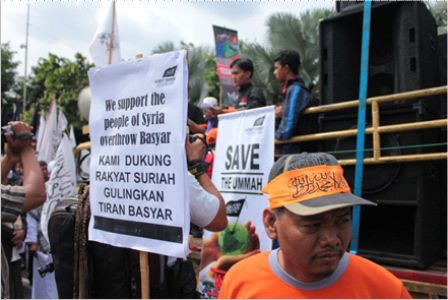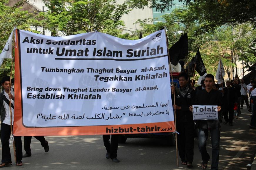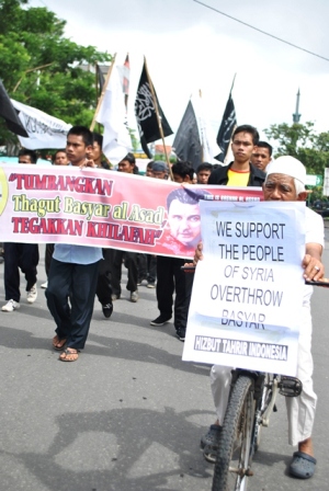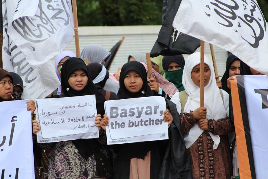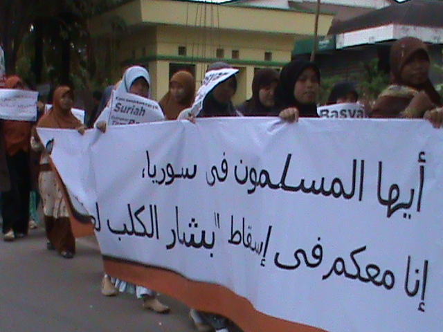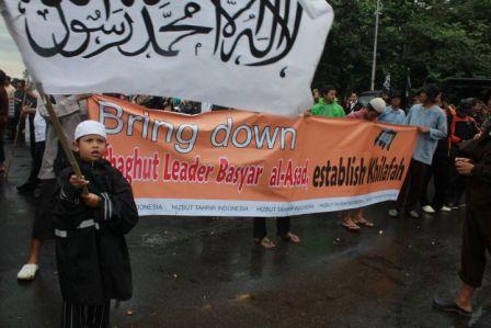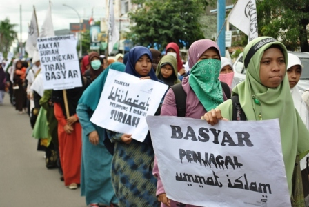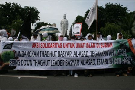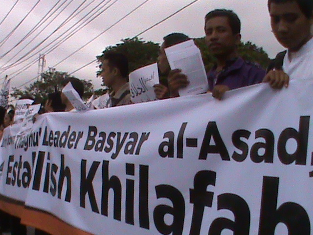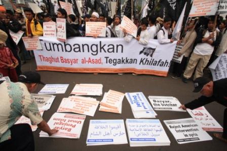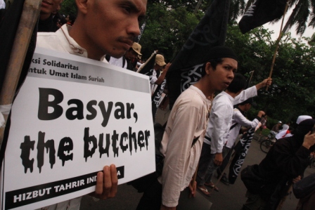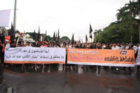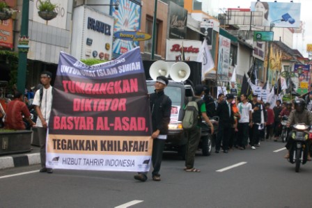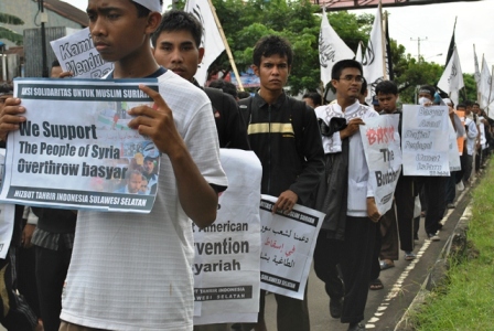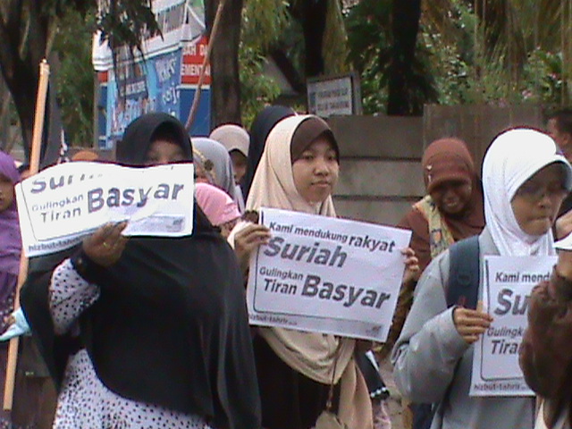 نظم حزب التحرير إندونيسيا عشرات من الاحتجاجات والخطب في كل من مدن : جاكرتا، ميدان، يوجياكارتا، سورابايا، بانجارماسين، ماكاسار وكيندارى وسار فيها الآلاف من المسلمين نصرة لإخوانهم . وجرت الاحتجاجات لوضع حد لوحشية نظام الأسد نحو المسلمين في سوريا وتقديم الدعم لهم لاسقاط نظام حكم بشار الأسد وإقامة الخلافة الإسلامية.