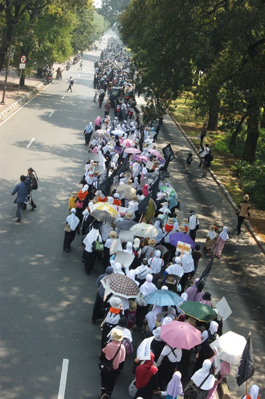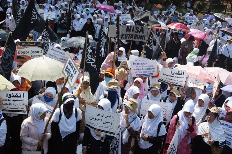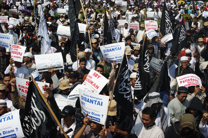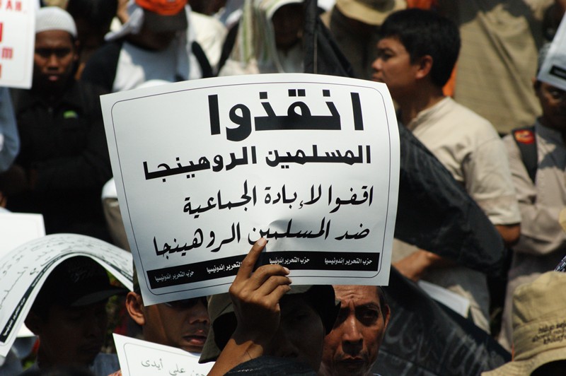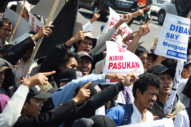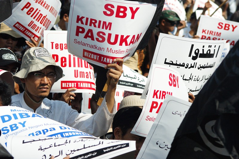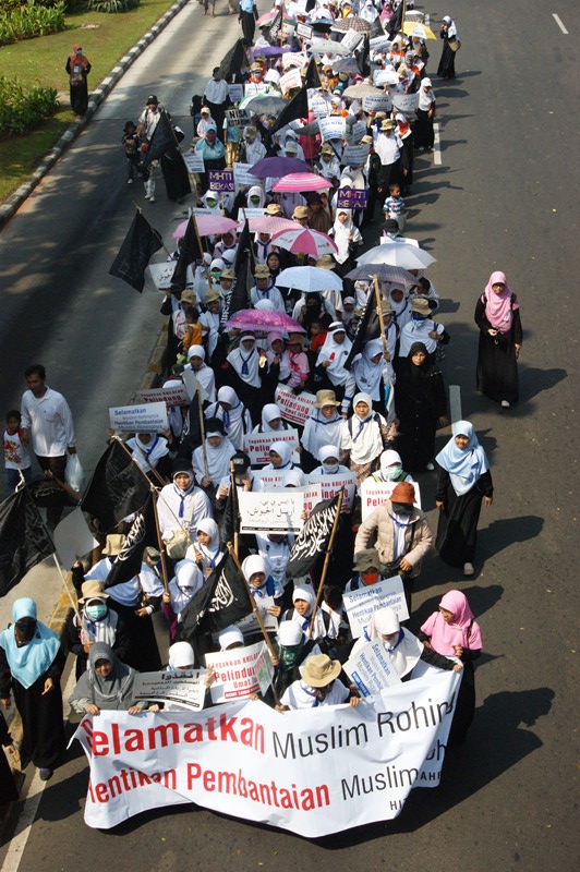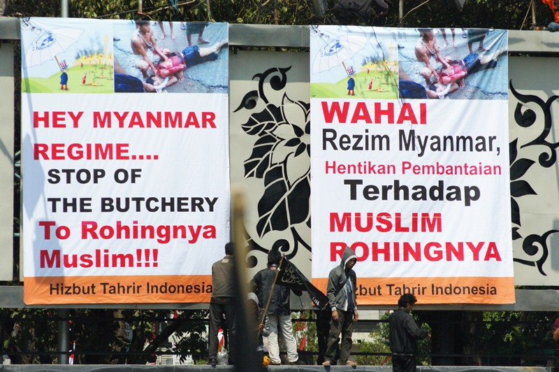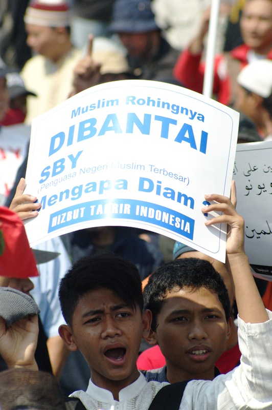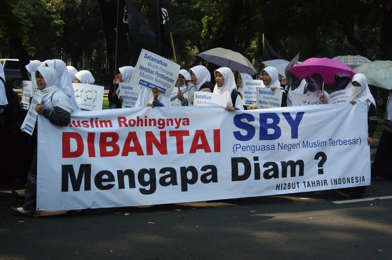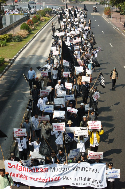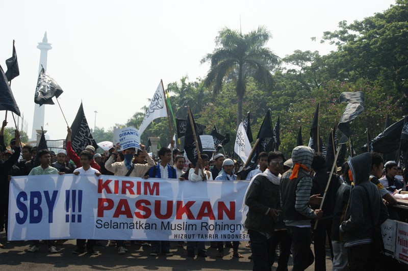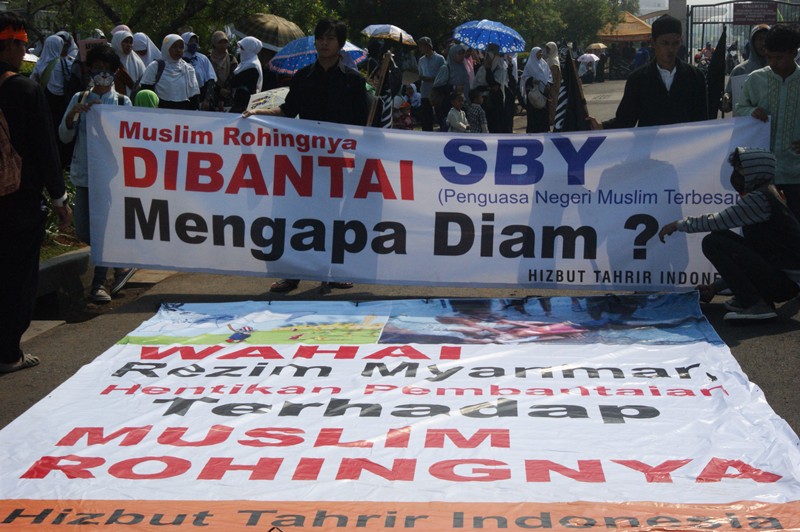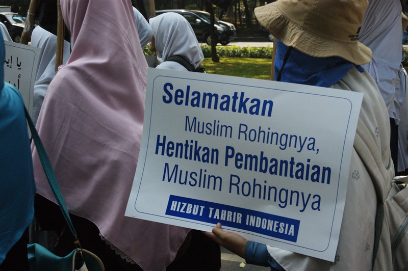 نظم حزب التحرير / إندونيسيا (HTI) يوم الجمعة 03 آب/أغسطس 2012م مظاهرة أمام سفارة ميانمار في جاكرتا لإدانة النظام البوذي الذي يذبح مسلمي روهينغيا في أراكان.. وفي يوم الأحد الموافق 05 آب/أغسطس نظم الحزب مسيرة طويلة شارك فيها نحو 4000 من أعضائه انطلقت من النصب التذكاري الوطني إلى القصر الرئاسي إلى نصب سوسيلو (urge SBY) مذكرة بأن إندونيسيا زعيمة رابطة أمم جنوب شرق أسيا (ASEAN) وأكبر بلد مسلم عليها العمل على وقف الإبادة الجماعية ضد المسلمين في أراكان من خلال تعبئة الجيش.