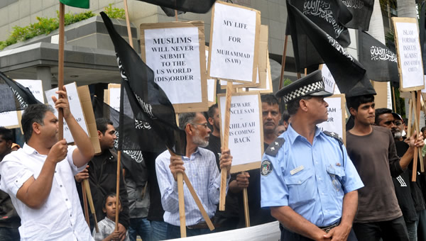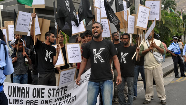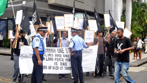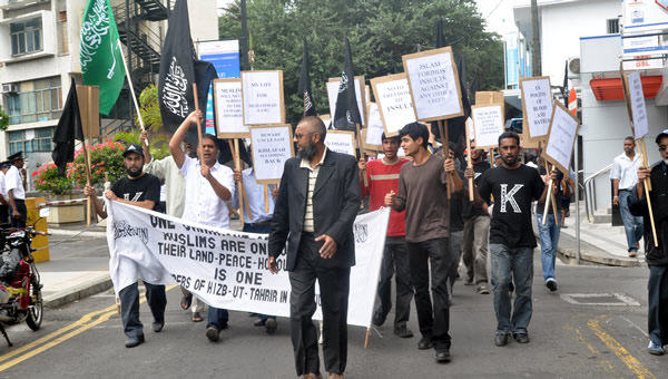جانب من المسيرة التي نظمها شباب حزب التحرير في جزيرة موريتوشس للاحتجاج على الفيلم المسيء للنبي صلى الله عليه وسلم، حيث سارت المسيرة باتجاه السفارة الامريكية في الجزيرة وسلموها رسالة احتجاج.