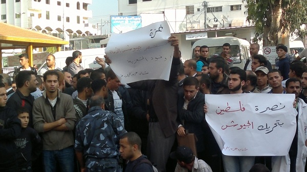 أمام تجمع عدد من القوى والشخصيات المصرية القادمة للتضامن مع قطاع غزة التي يقتل أهلها ليل نهار وليس آخرها جريمة قتل عائلتي الدلو وعزام، قام يوم الاثنين 05 محرم الحرام 1434هـ الموافق 19 تشرين الثاني/نوفمبر 2012م عدد من شباب حزب التحرير في مستشفى الشفاء بمدينة غزة برفع يافطات كتب عليها "غزة تستنصر جيوش الأمة لا وفود التعزية"، "نصرة فلسطين بتحريك الجيوش" حيث ضم هذا التجمع خطيب الثورة المصرية، ورئيس حزب العدالة والتنمية المصري سعد الكتاتني، إضافة إلى نبيل شعث كممثل عن سلطة عباس وغيرهم.