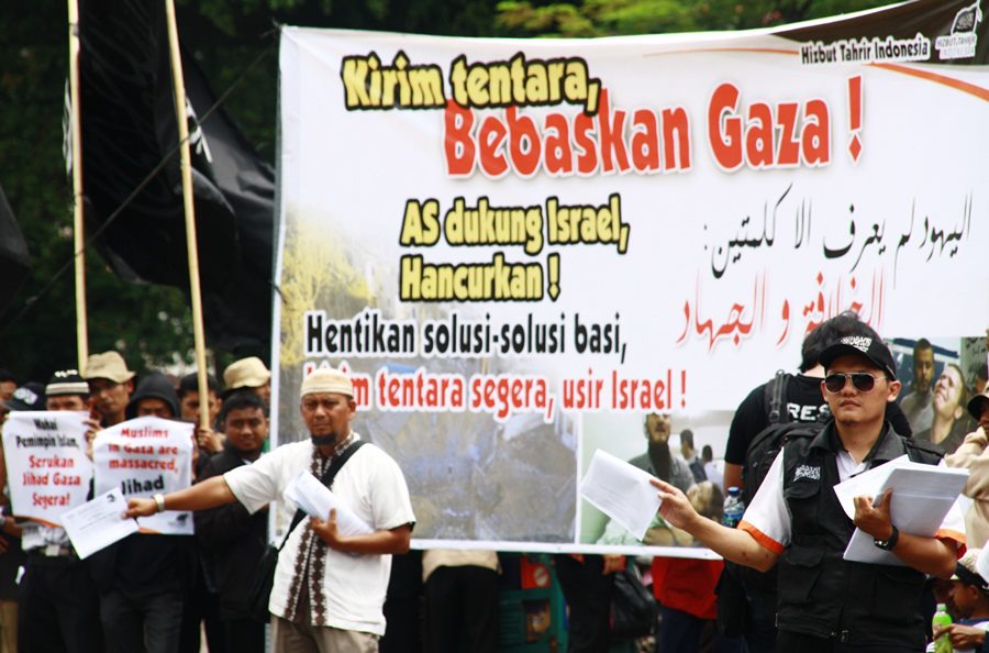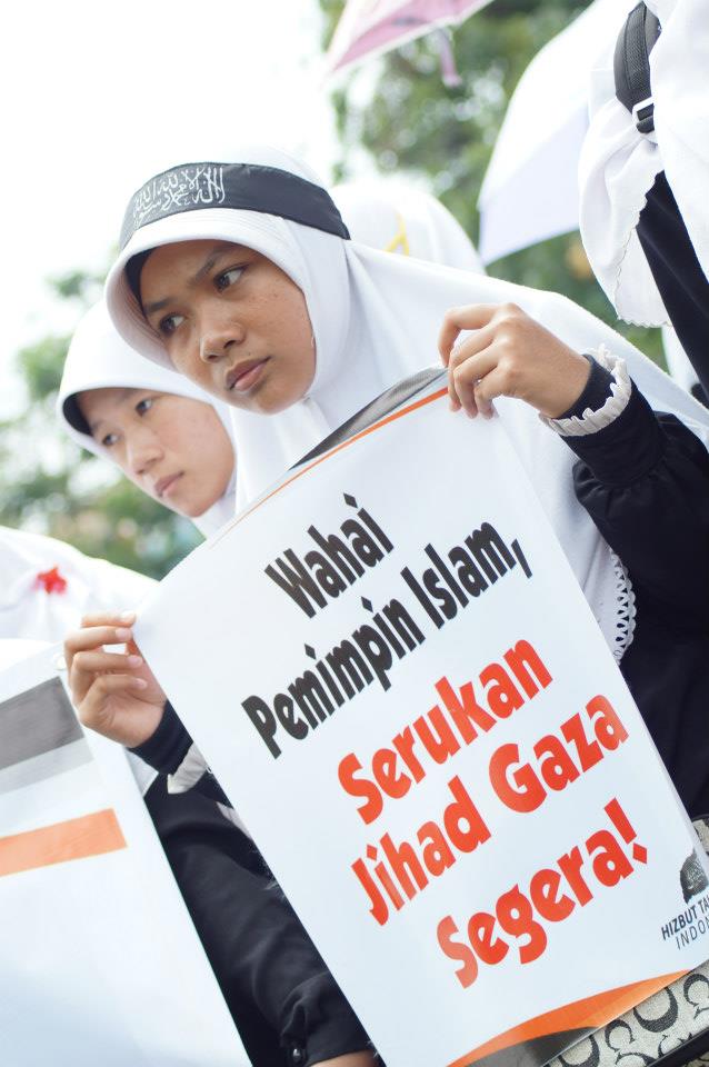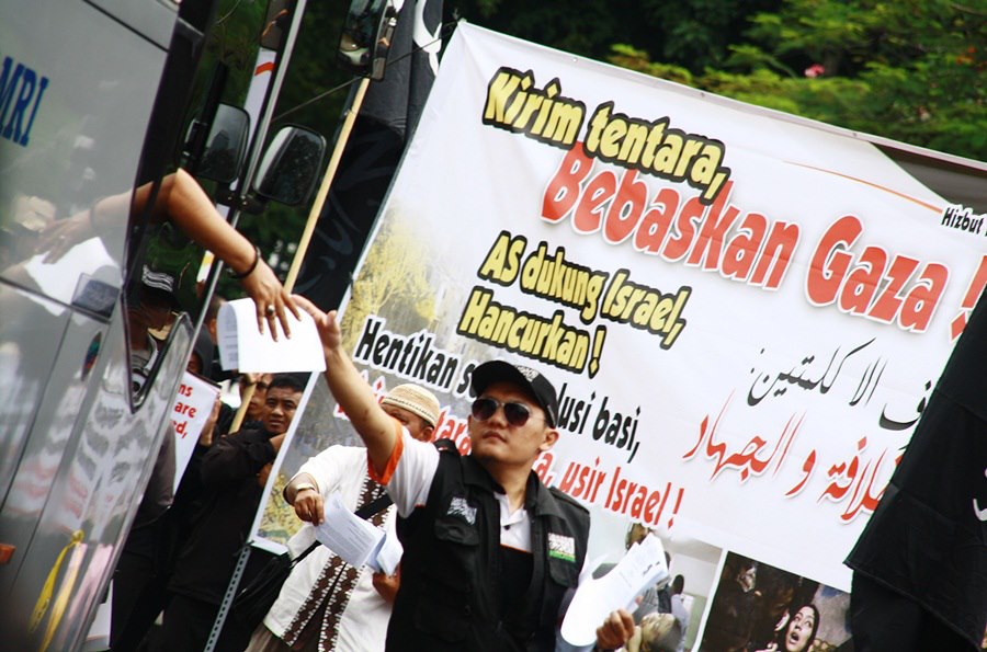 احتشد المئات من أعضاء حزب التحرير / إندونيسيا يوم الاثنين 05 محرم الحرام 1434هـ الموافق 19 تشرين الثاني/نوفمبر 2012م أمام السفارة الأمريكية في جاكرتا، حيث أدانوا الدعم الأمريكي المنقطع النظير لكيان يهود الذي ما انفك يسفك دماء المسلمين في أرض فلسطين المباركة عامة وفي قطاع غزة خاصة، وناشدوا الرئيس الإندونيسي بصفته رئيساً لأكبر بلد إسلامي من حيث التعداد السكاني بأن يعلن النفير العام ويجيش الجيوش لنصرة المسلمين في غزة واجتثاث كيان يهود الغاصب الذي لا يفقه إلا لغة الحرب والقتال.