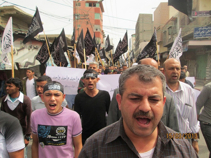 وقد انطلقت الحشود للوقفة من المسجد العمري وغيره وسط هتافات: "قائدنا للأبد سيدنا محمد"، " لن نركع إلا لله"، "خلافة للأبد غصبا عنك يا أسد"، و"واحد واحد الدم المسلم واحد"، ورفعت عدة شعارات مثل: "الخلافة مطلبنا رغم أنف أمريكا وروسيا "، "الأمة تريد خلافة من جديد".