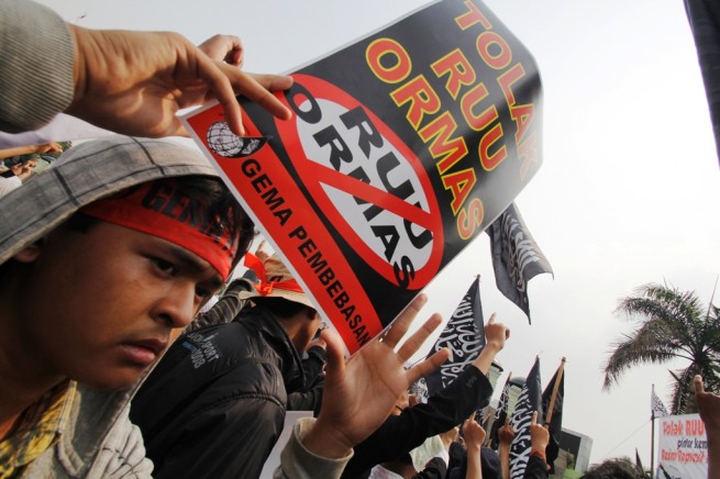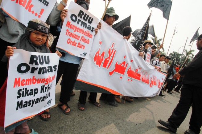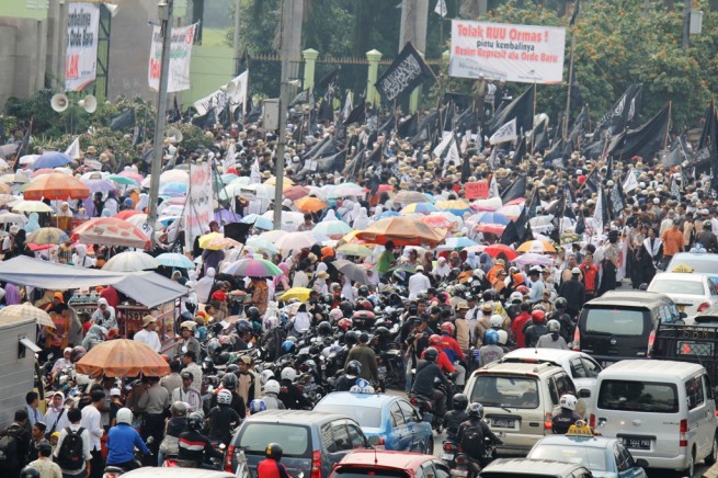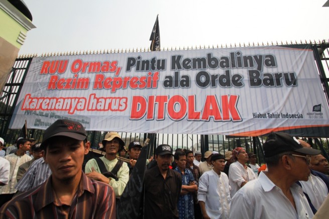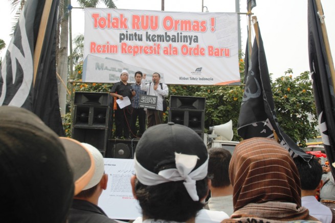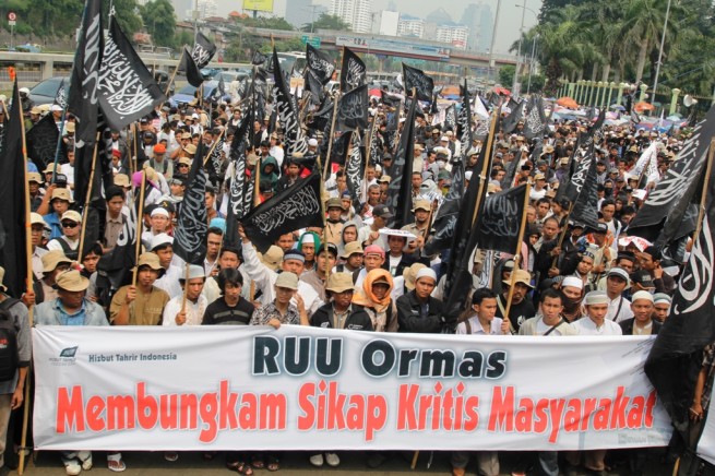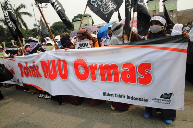 سيَّر حزب التحرير / إندونيسيا يوم الخميس 16 جمادى الأولى 1434هـ الموافق 28 آذار/مارس 2013م ضمن حملته المكثفة لرفض مشروع قانون المنظمات الاجتماعية الذي يناقشه مجلس النواب حالياً، مسيرات في العديد من المدن الإندونيسية الكبرى، كان أبرزها مسيرة جاكرتا التي شارك فيها ما يزيد عن 5000 متظاهر والتي أحاطت بمبنى مجلس النواب صادحة برفض المسلمين لمشروع القانون الذي يستهدف الإسلام والمسلمين، وقد شاركت منظمات وأحزاب إسلامية أخرى في المسيرة استجابة لدعوة الحزب لها.