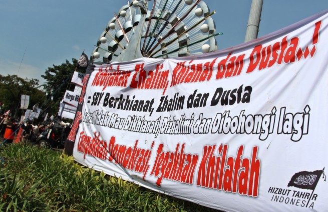 نظم حزب التحرير / إندونيسيا مسيرة أمام القصر الرئاسي في جاكرتا احتجاجاً على رفع أسعار الوقود تحت عنوان