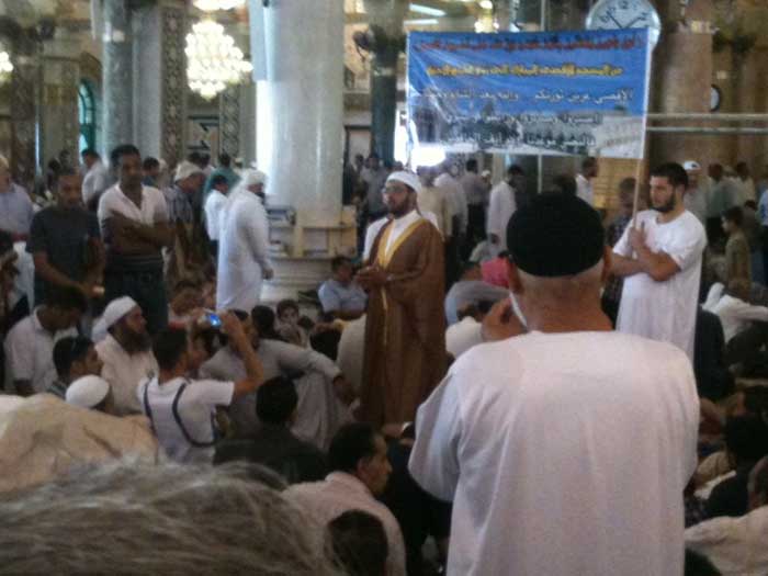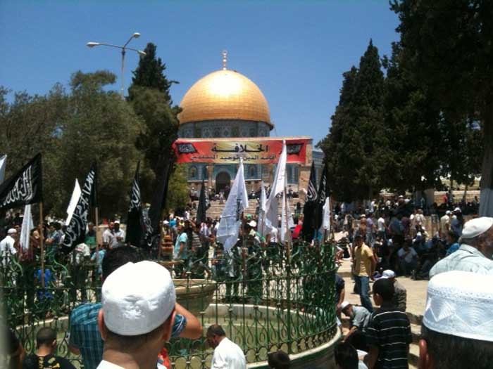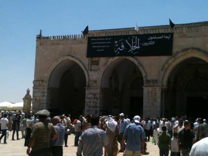 وخلال الدروس علت أصوات التكبير والهتاف بعودة الخلافة ورفعت الرايات على الكأس في وسط المسجد الأقصى ورفعت يافطات كبيرة على أسوار قبة الصخرة كتب عليها "الخلافة هي إقامة الدين وتوحيد المسلمين، ويافطة كتب عليها الأمة تريد تحكيم القران" ويافطة علقت على المسجد الأقصى "أيها المسلمون الثائرون الخلافة هي فرض ربكم ومبعث عزكم".
