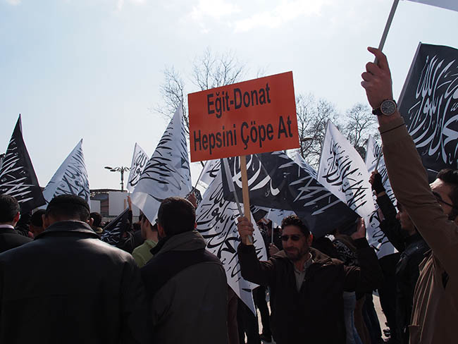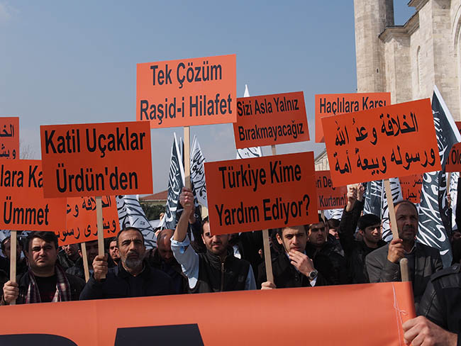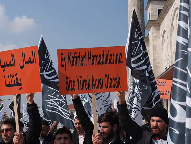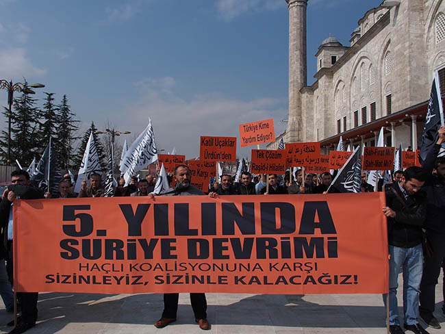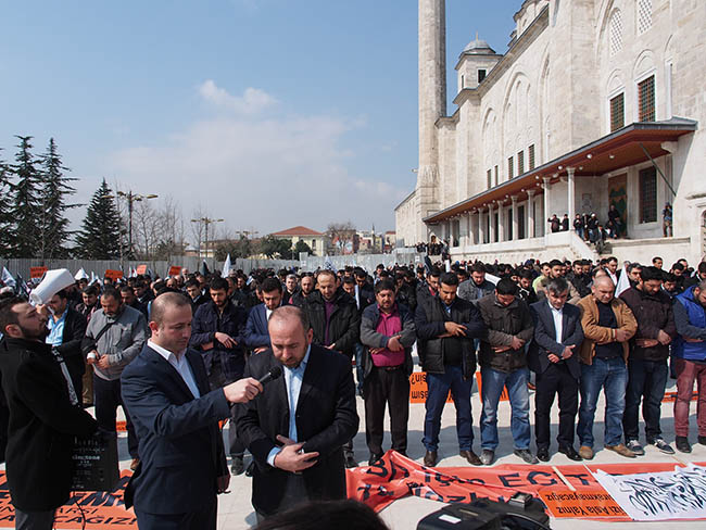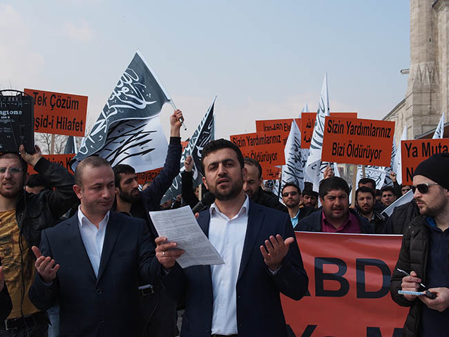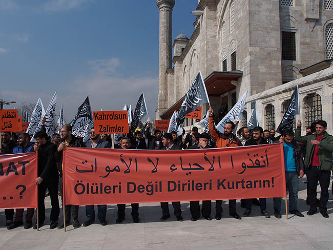 نظم حزب التحرير / ولاية تركيا وأنصاره وقفة في مسجد محمد الفاتح بمدينة اسطنبول عقب صلاة الجمعة 22 جمادى الأولى 1436هـ الموافق 13 آذار/مارس 2015م ضد التحالف الصليبي الغاشم ونصرة لثورة أهل الشام المخلصين تحت عنوان "سوريا.. نحن معك وسنبقى معك!".