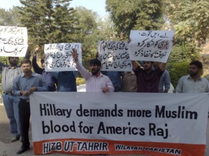 حزب التحريرفي باكستان ينظم مسيرات إحتجاجية على زيارة هليري كلينتون