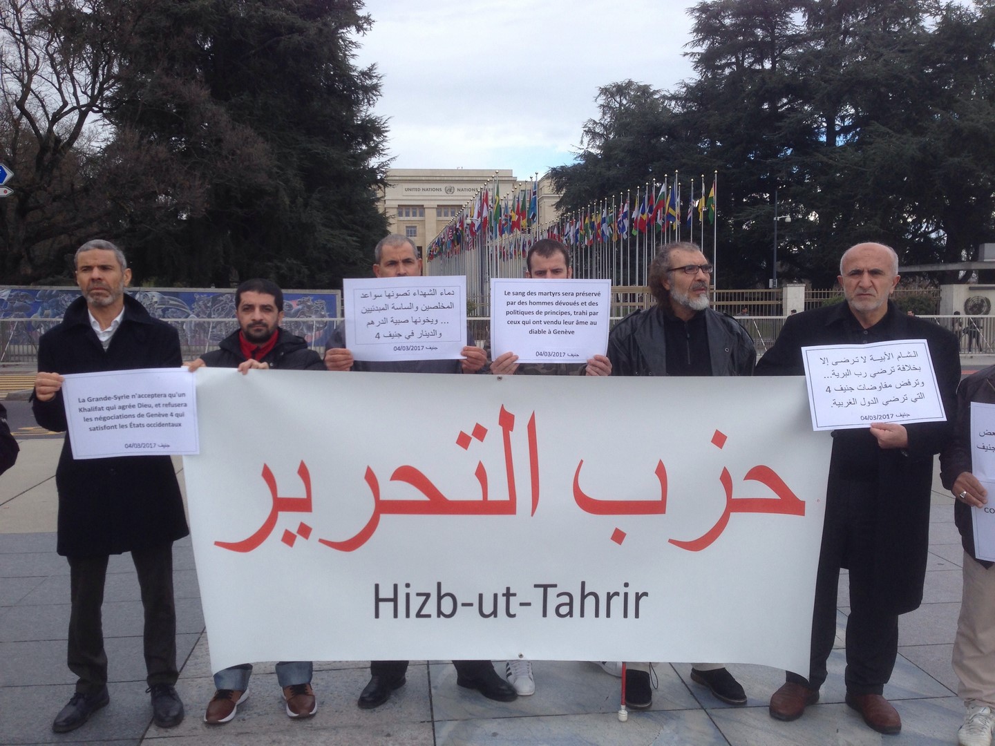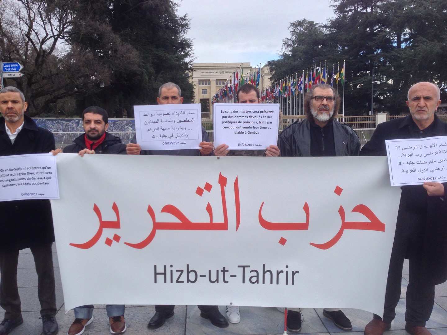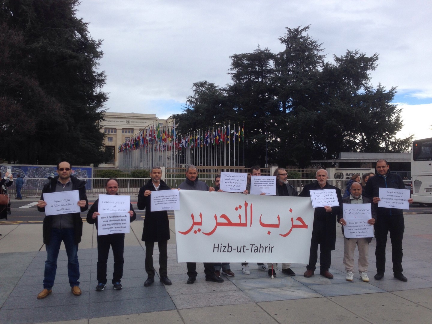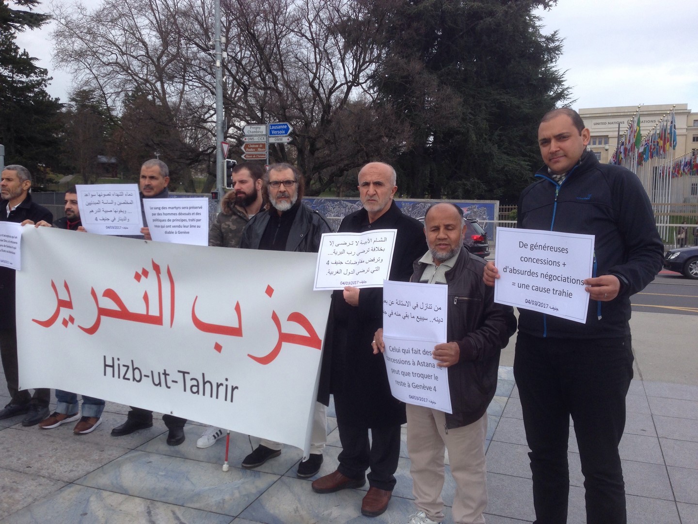قام شباب حزب التحرير في سويسرا يوم السبت 05 جمادى الآخرة 1438هـ الموافق 04 آذار/مارس 2017م بتنظيم وقفةٍ أمام مبنى الأمم المتحدة في جنيف احتجاجاً على عقد جولةٍ جديدةٍ من المفاوضات بين ما يسمى بالمعارضة السورية وبين شبيحة النظام السوري المجرم، وقد تضمنت الوقفة رفع لافتةٍ كبيرةٍ كتب عليها حزب التحرير باللغة العربية والإنجليزية للتعريف بأن من نظم هذه الوقفة هم شباب حزب التحرير، وأما الشعارات التي رفعها الشباب فقد كانت باللغة العربية مع ترجمتها إلى اللغة الفرنسية، وكانت الشعارات كما يلي: