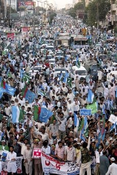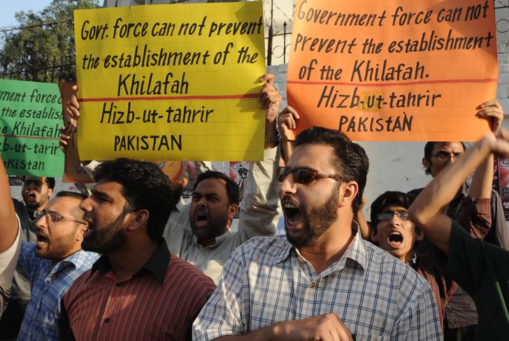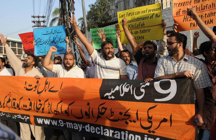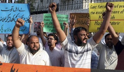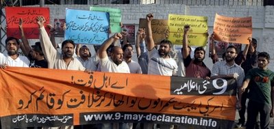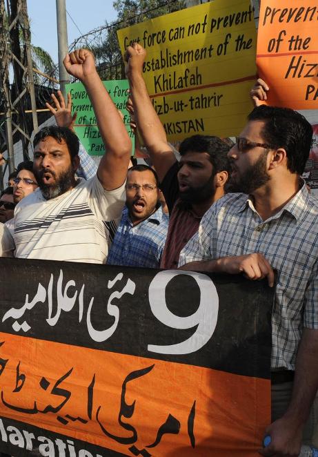 شباب من حزب التحرير - ولاية باكستان يهتفون ويرفعون شعارات خلال اجتماع حاشد ضد سياسات الولايات المتحدة والتدخل الأمريكي المزعوم في الشؤون الباكستانية خلال احتجاج في لاهور و كراتشي يوم 9 ايار / مايو 2010 على مقتل عشرة أشخاص يوم الاحد 9 ايار / مايو في هجوم للولايات المتحدة في المنطقة القبلية في باكستان والقريبة من الحدود الافغانية.