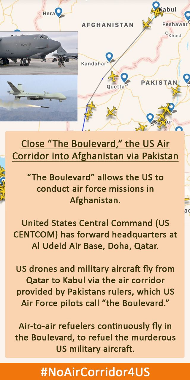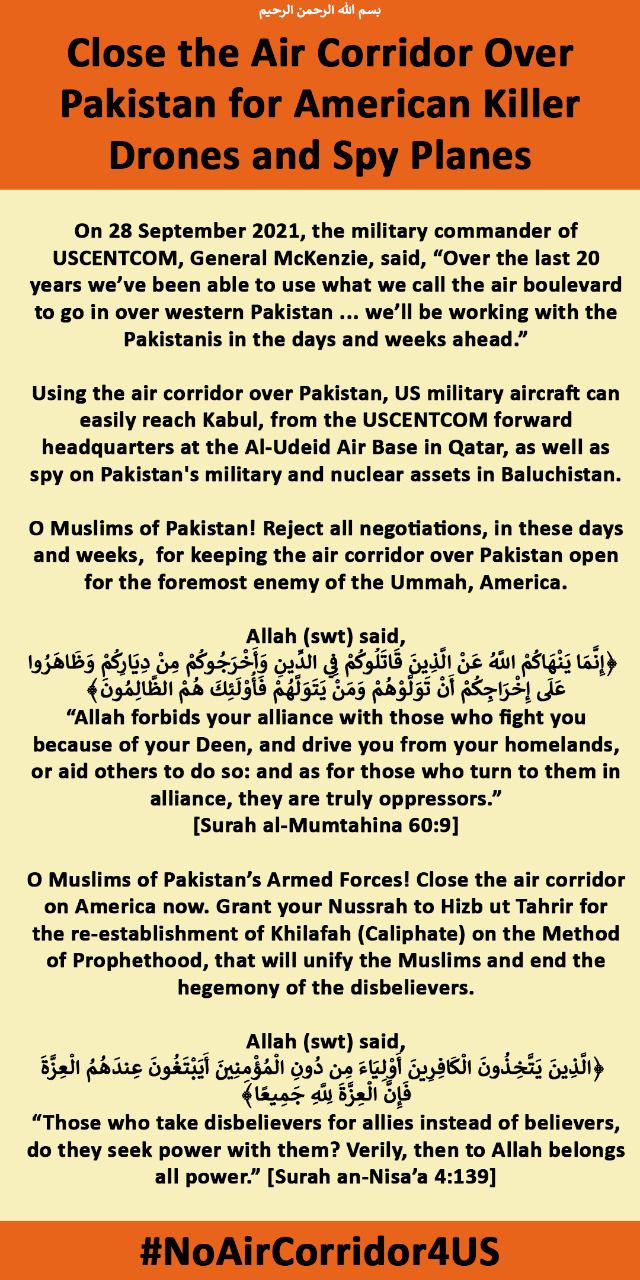 Hizb ut Tahrir / Wilayah Pakistan has launched a powerful campaign on social media demanding the closure of Pakistan's airspace to American killer drones and spy planes. The Hashtag is #NoAirCorridor4US. On 28 September 2021, the military commander of USCENTCOM, General McKenzie, said, “Over the last 20 years we’ve been able to use what we call the air boulevard to go in over western Pakistan ... we’ll be working with the Pakistanis in the days and weeks ahead.” Using the air corridor over Pakistan, US military aircraft can easily reach Kabul, from the USCENTCOM forward headquarters at the Al-Udeid Air Base in Qatar, as well as spy on Pakistan's military and nuclear assets in Baluchistan.