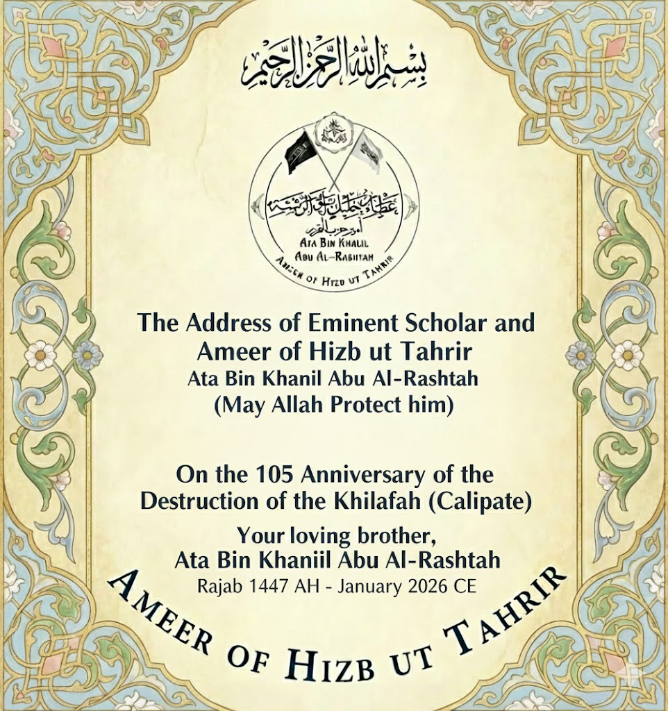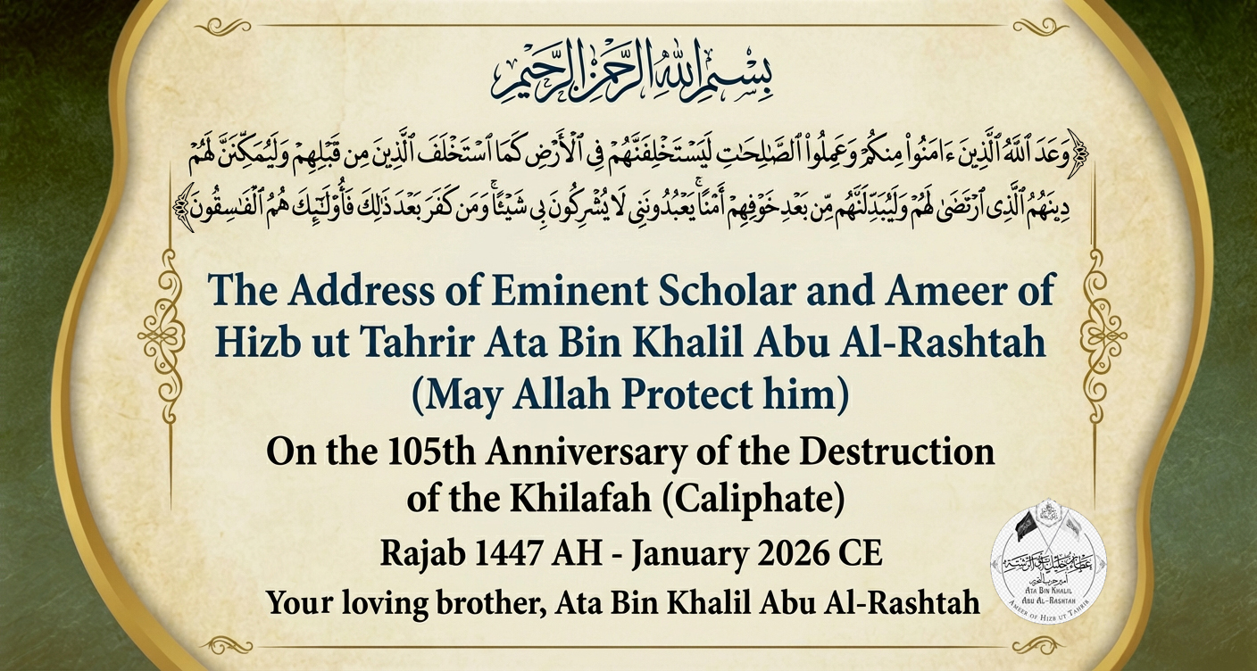 In the sacred month of Rajab of this year, 1447 AH (2026 CE), we commemorate the 105th anniversary of the destruction of the Islamic State by Arab and Turkish traitors, agents of the kafir (disbelieving) colonizers. This state was established by the Master of Messengers, Muhammad (peace and blessings be upon him), and his Noble Companions (may Allah be pleased with them all). The Islamic system of governance (the Caliphate) was abolished on the 28th of Rajab 1342 AH, corresponding to March 3, 1924 CE, at the hands of the criminal Mustafa Kemal. This tragic anniversary returns to us while the genocide committed by the Jewish entity against defenseless Muslims in the Gaza Strip continues, as do the brutal massacres perpetrated in the West Bank. These atrocities have resulted in the martyrdom, injury, and disappearance of more than 230,000 Muslim men and women over the past two years, the majority of whom are women, children, and the elderly. Furthermore, the senseless and bloody war raging in Sudan continues to claim the lives of innocent Muslims there, serving the interests of disbelieving America, which ignited the conflict between its agents to separate Darfur from Sudan, just as it previously separated South Sudan.